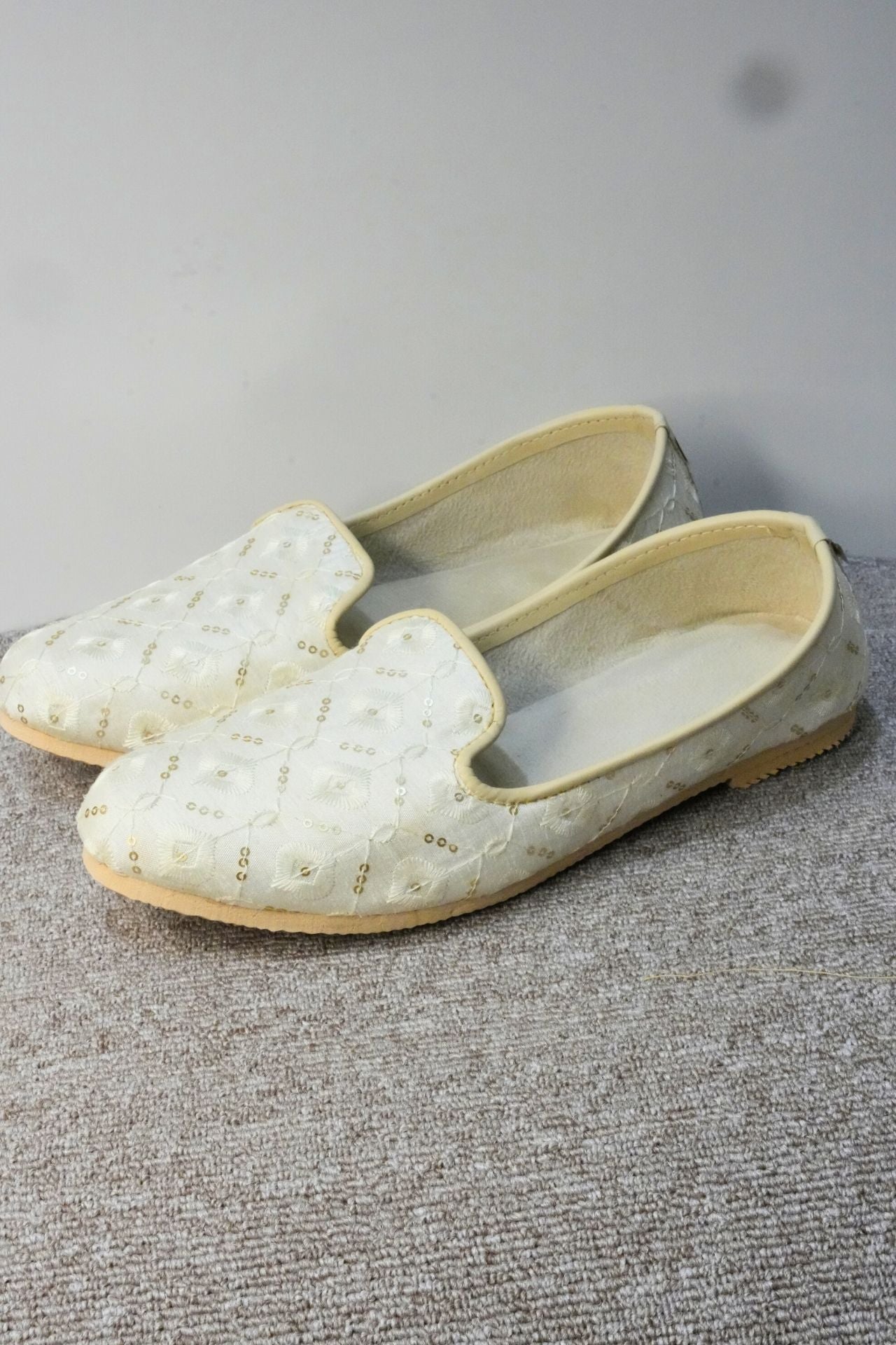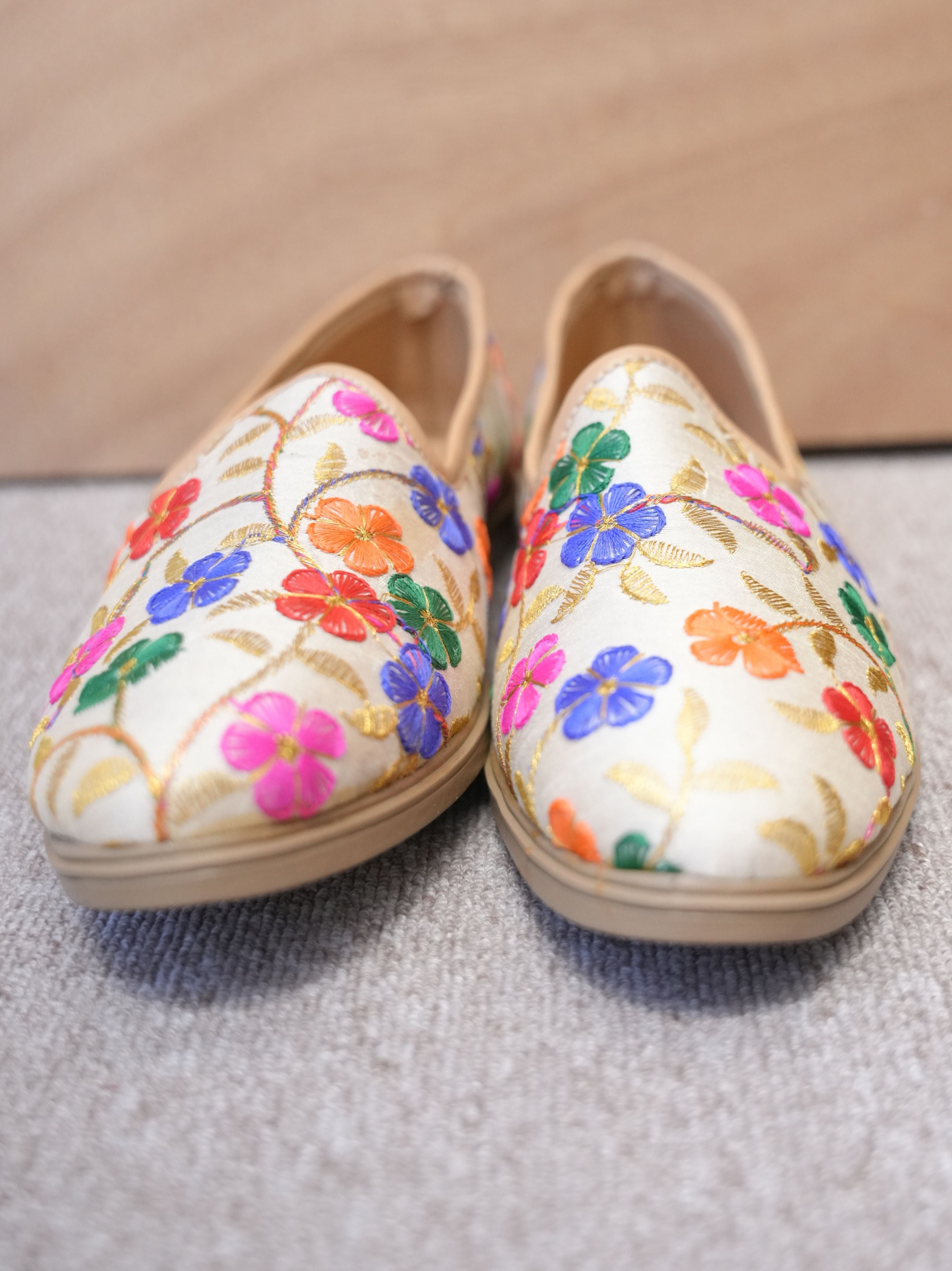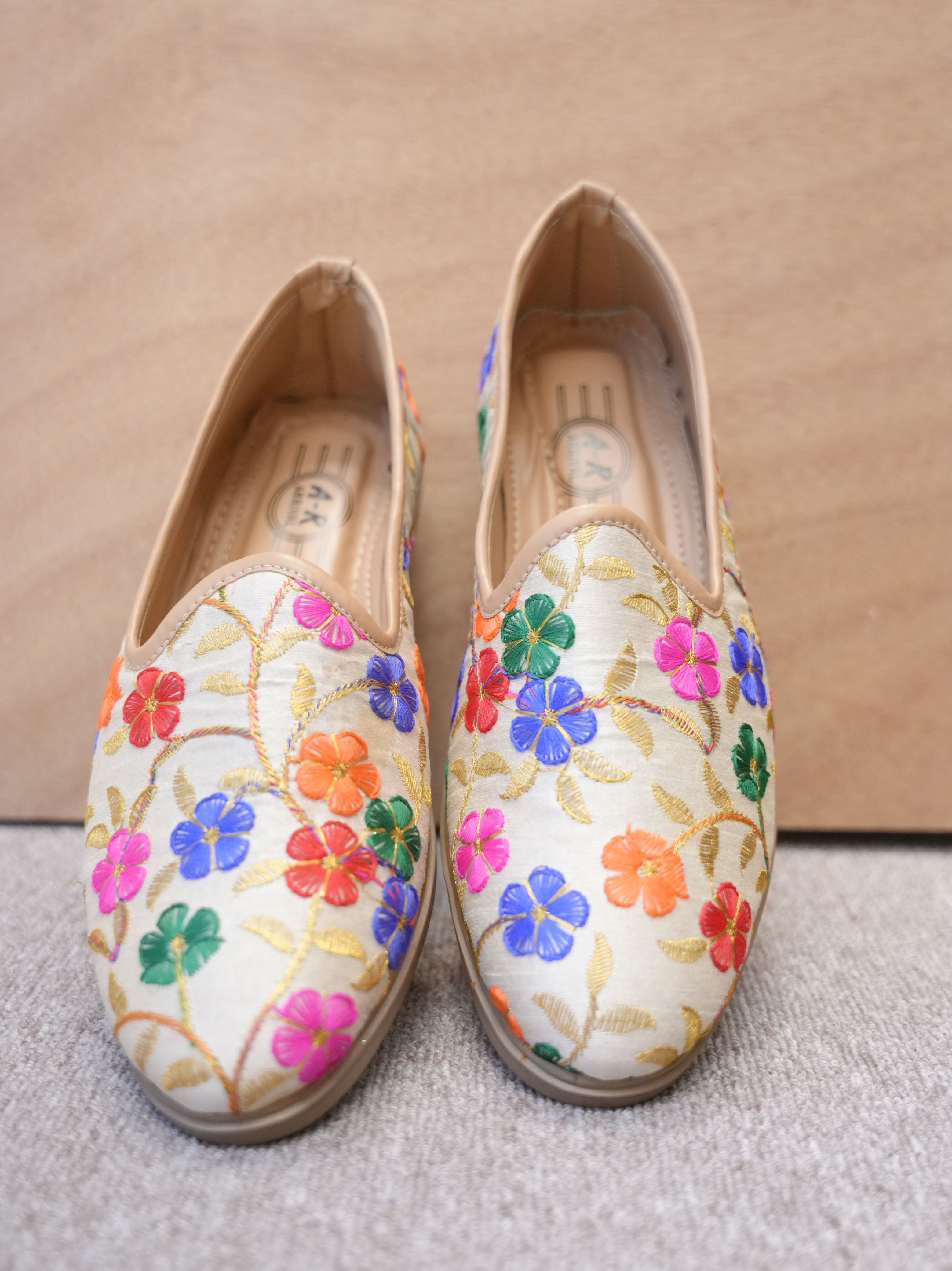 Cream Ethnic Mens Jooti With Flower Embroidered