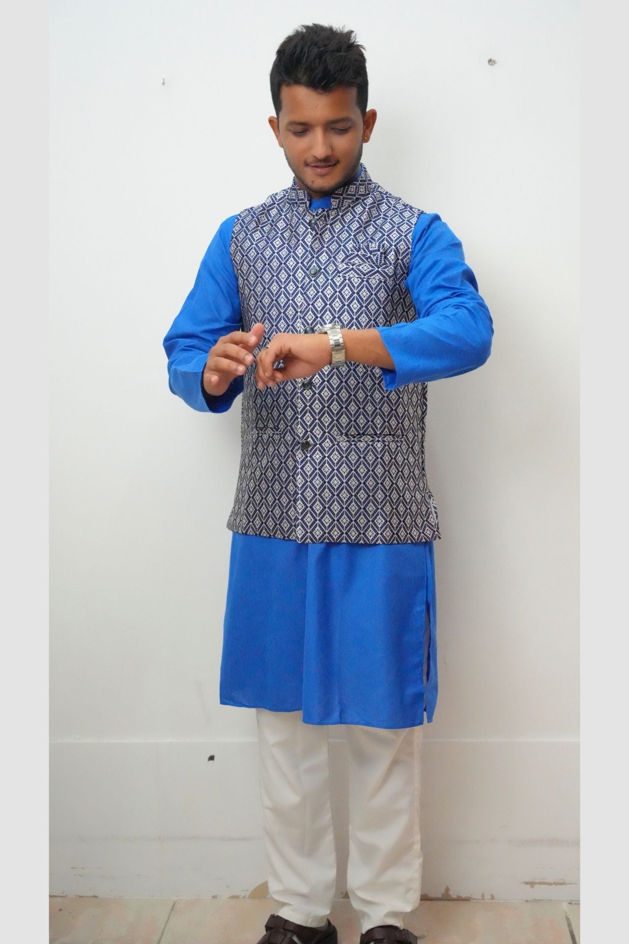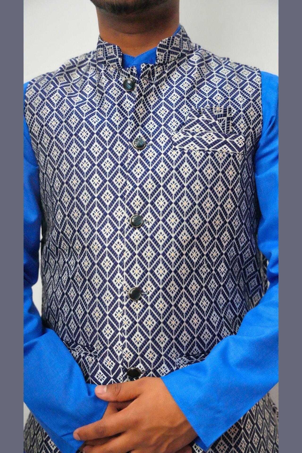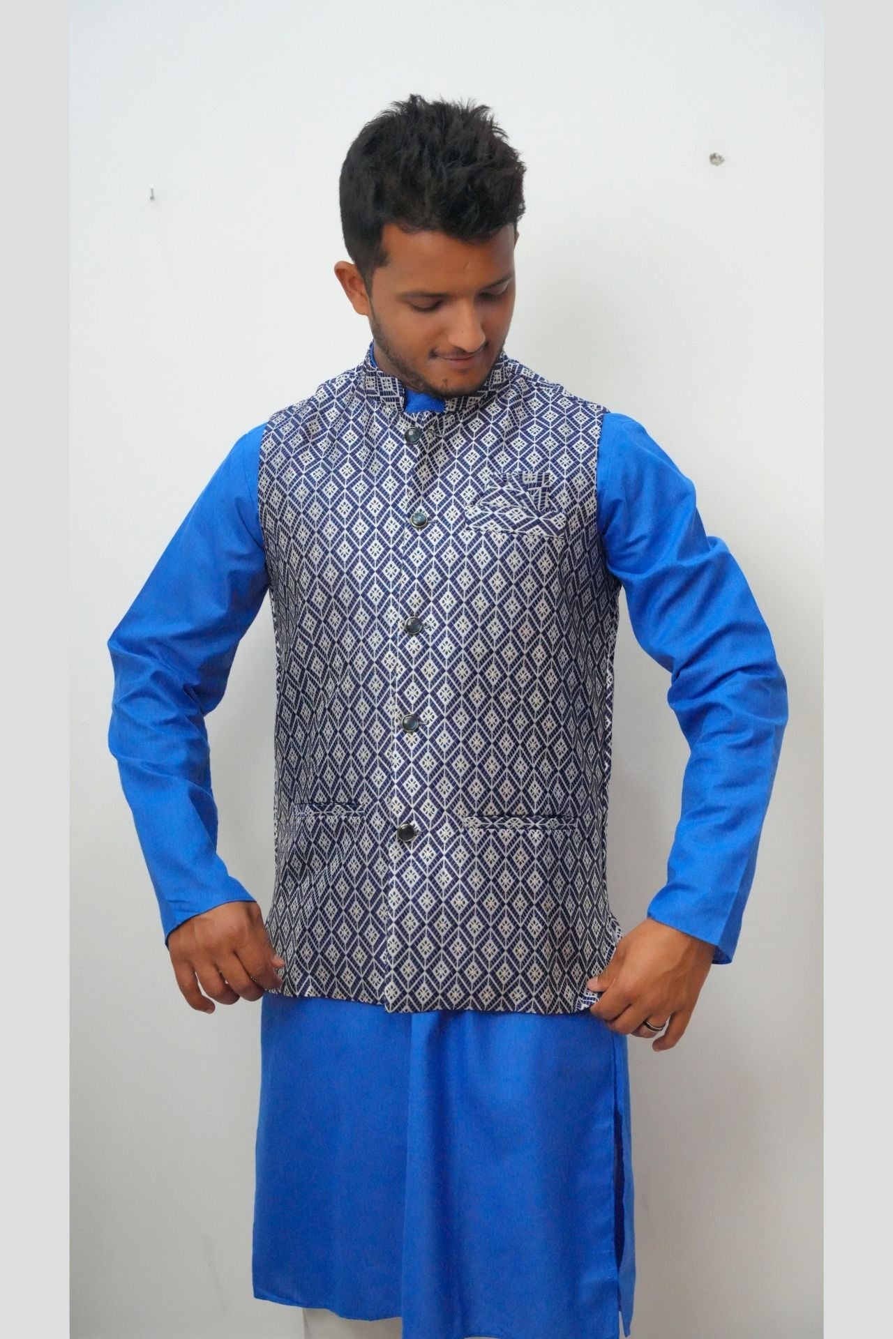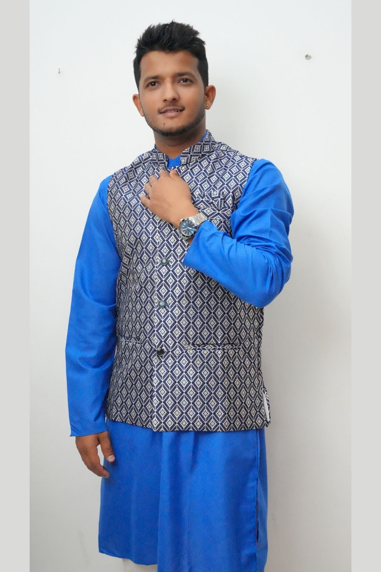 Men's Traditional Blue & White Dhaka Fabric Waistcoat & Topi Set