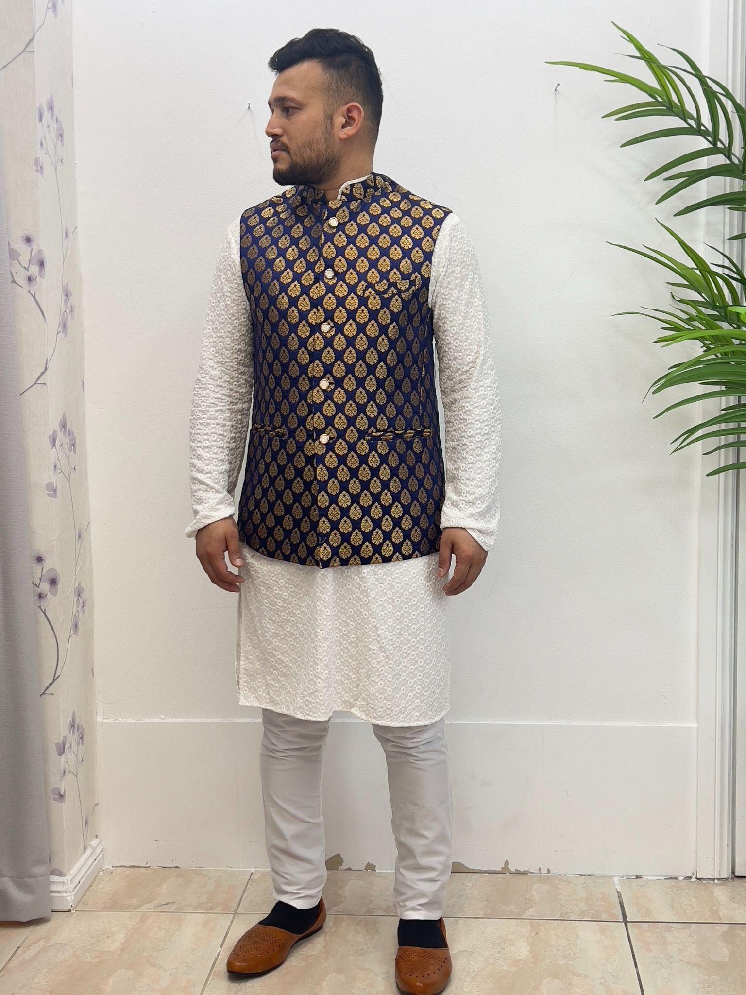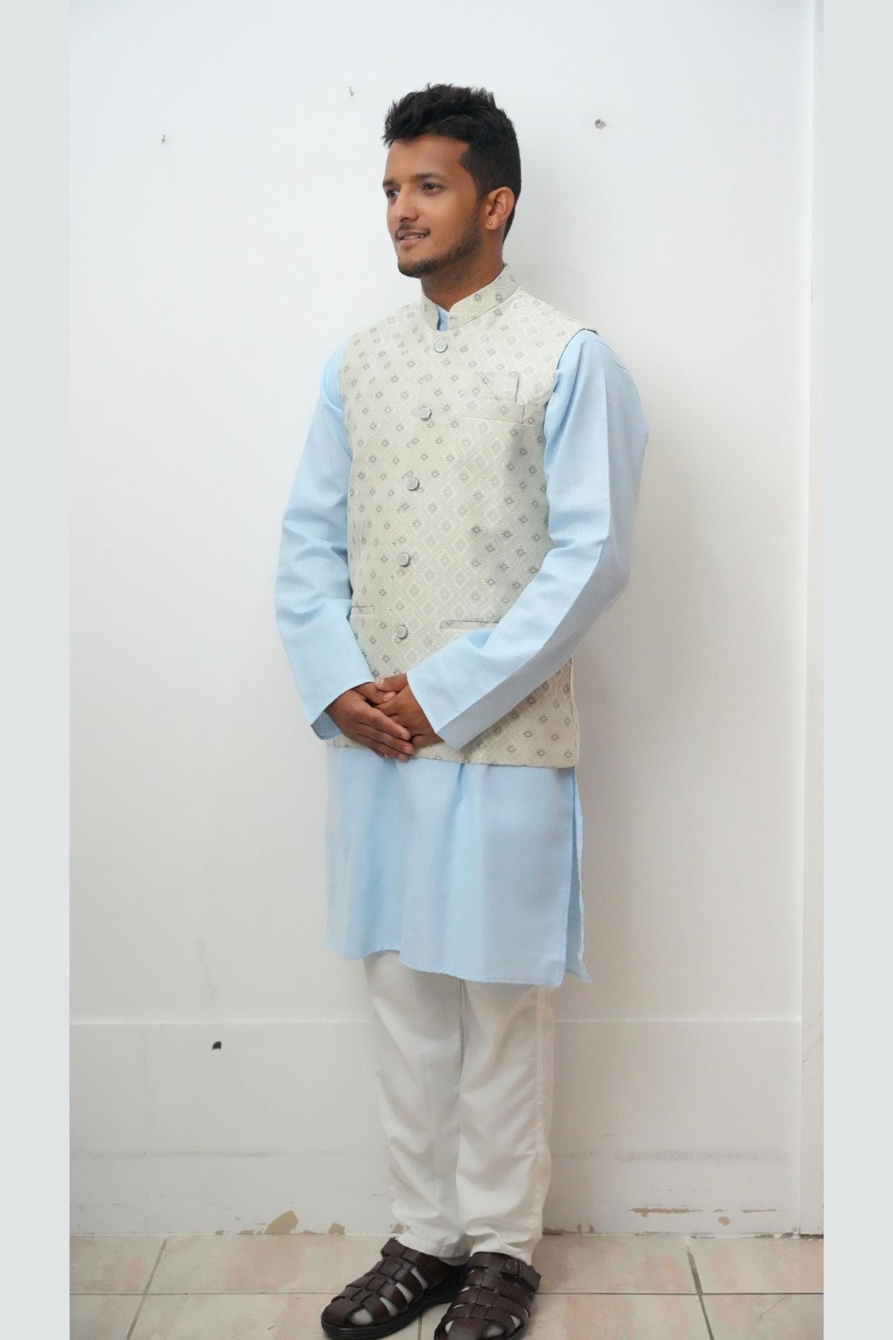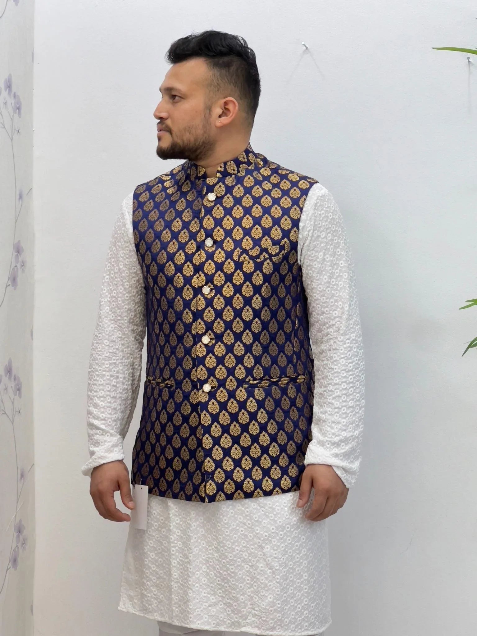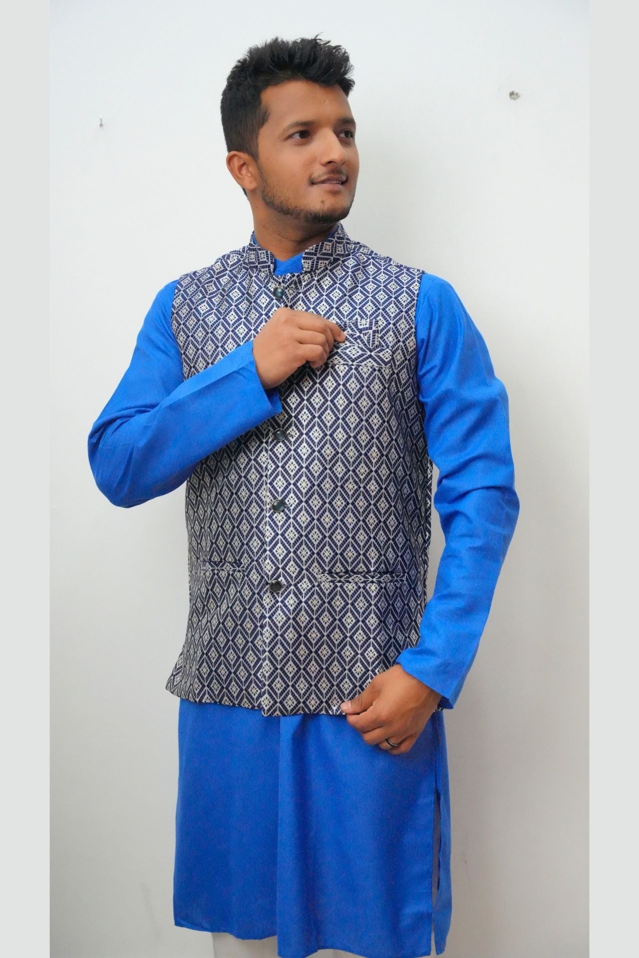 Men's Traditional Blue & White Dhaka Fabric Waistcoat & Topi Set
