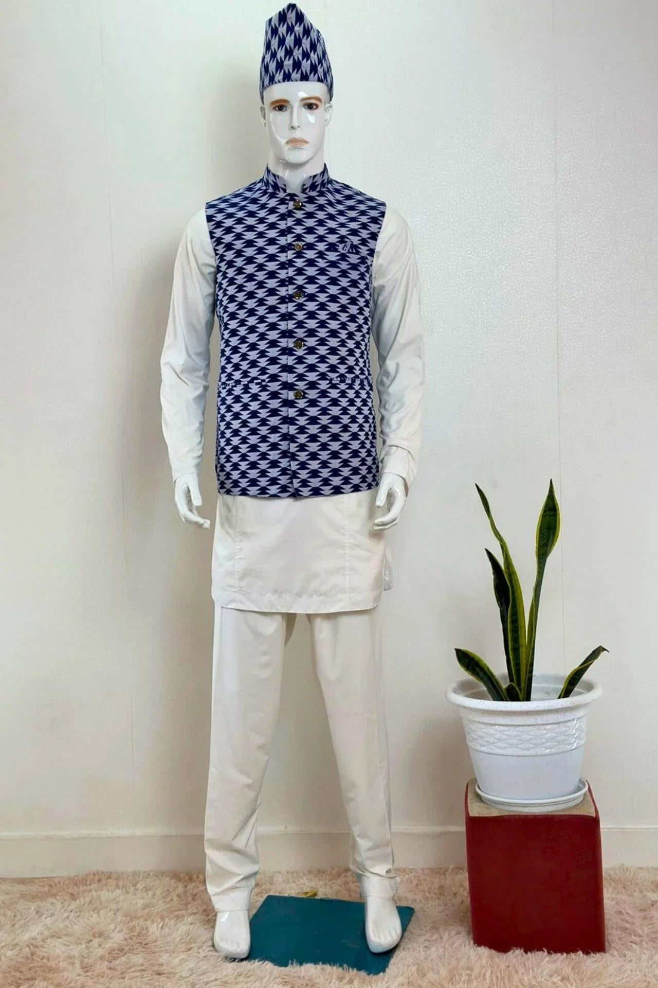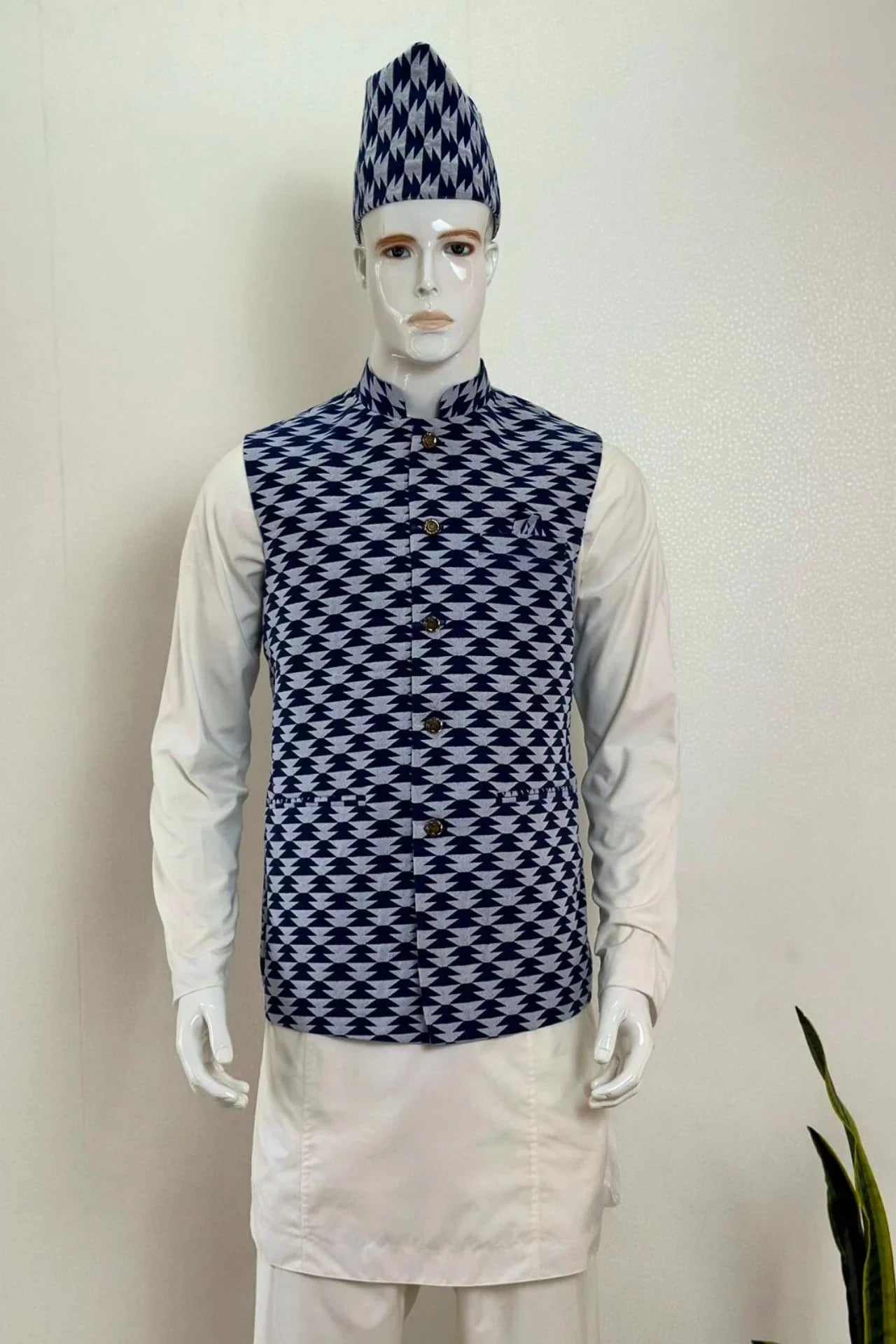 - Design : Classic Nehru-collar waistcoat with a full-button placket and a sleek, tailored fit. The matching Nepali topi features a traditional geometric design that complements the waistcoat.