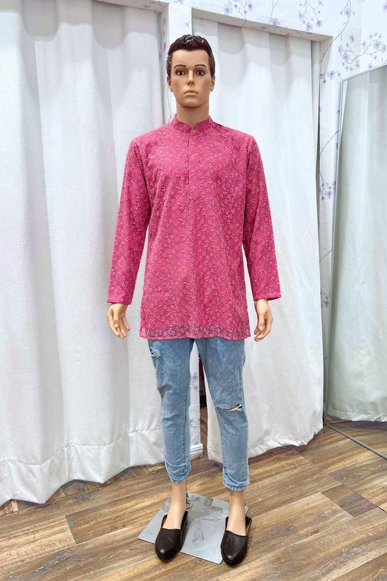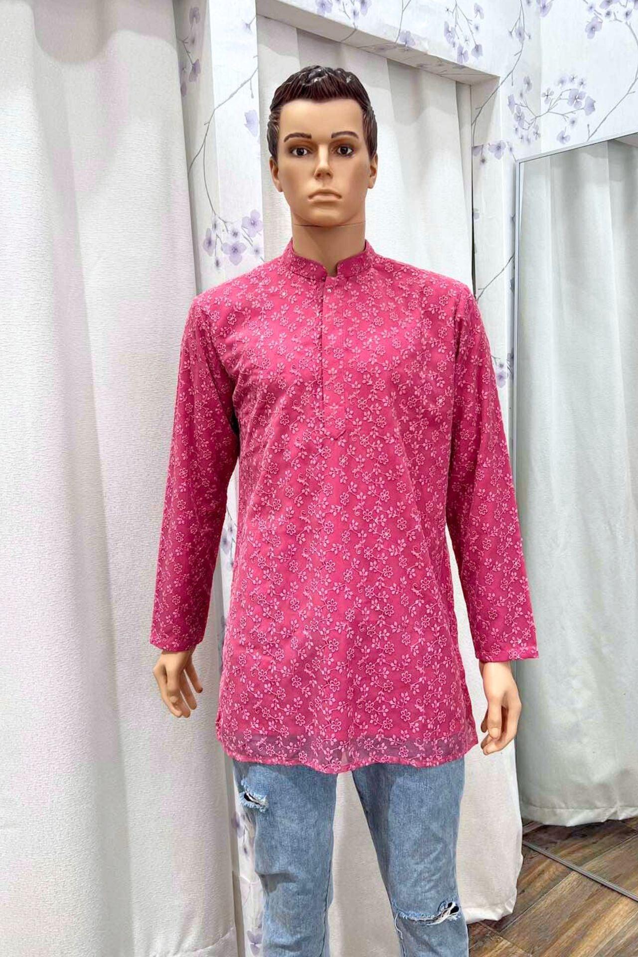 Men's Kurta Top Chickenkari Floral Embroidery In Rose