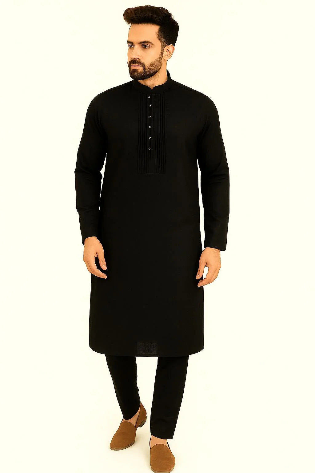 Highlights: The kurta features a sophisticated pin-tucked panel on the chest, which is accentuated with a row of decorative fabric buttons. The tone-on-tone detailing and the clean, structured silhouette give it a polished and formal look.