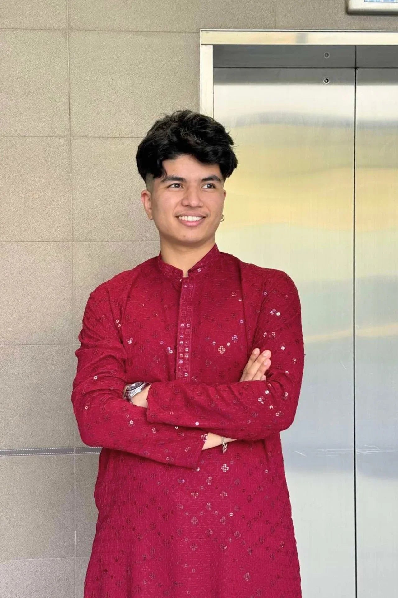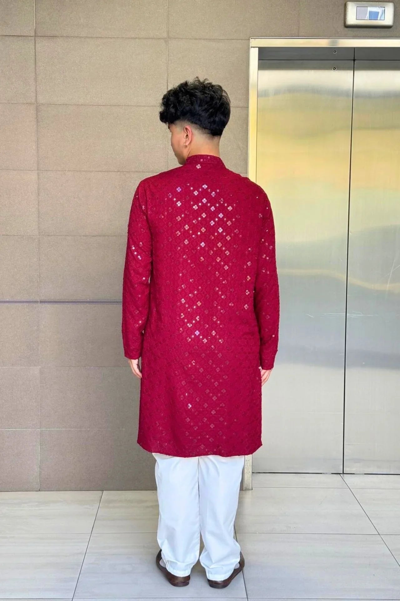 - Highlights: Deep and vibrant maroon color, intricate Chikankari style embroidery, and sparkling sequin work (or mukaish) scattered across the entire kurta.