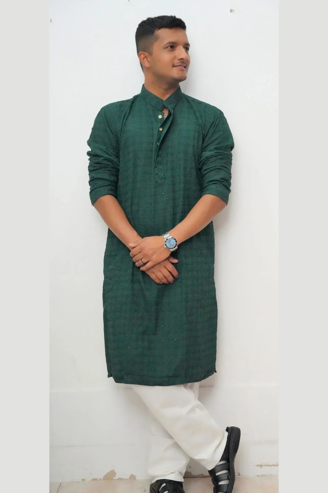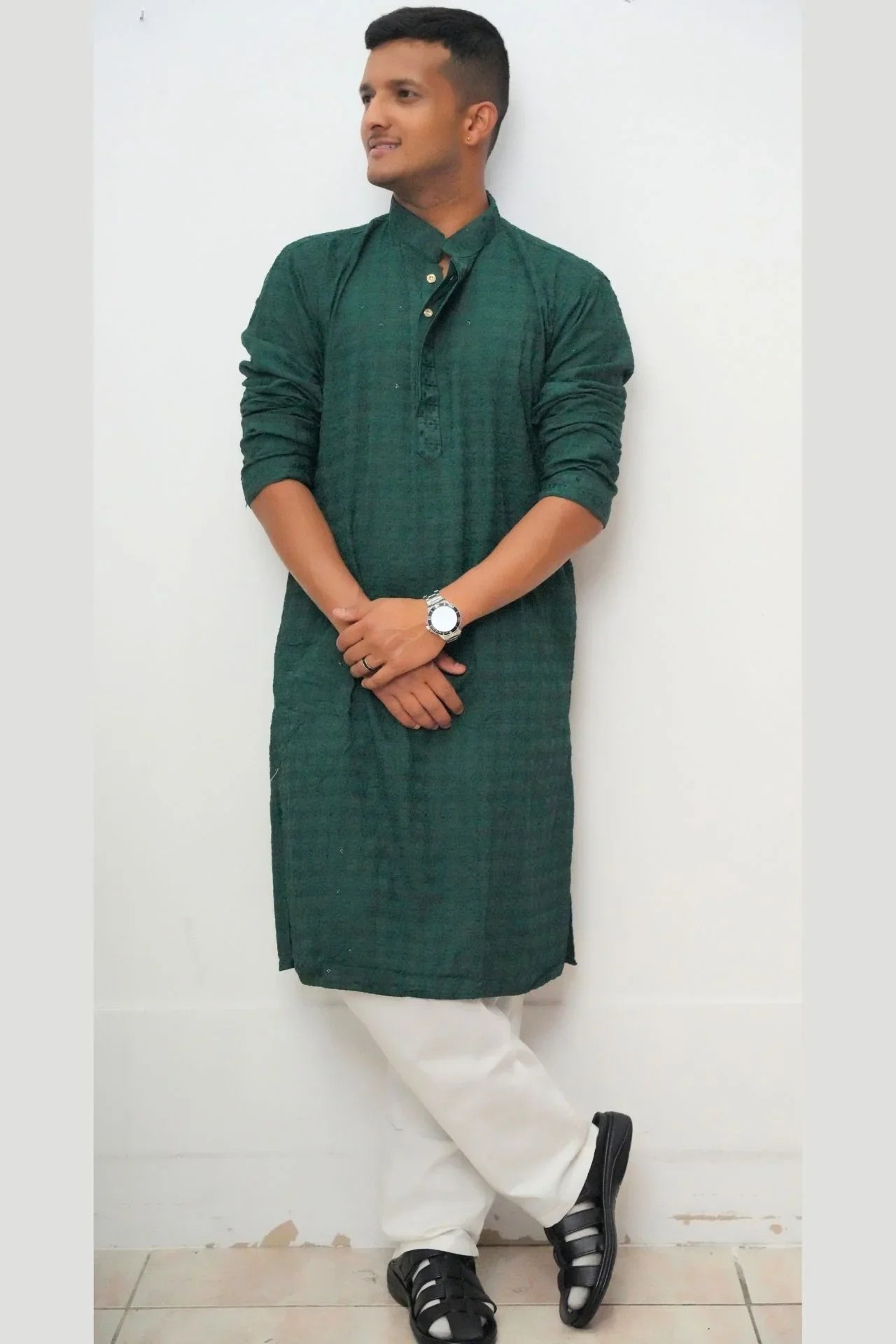 Highlights: Rich Forest Green fabric with a subtle, all-over self-design or textured pattern (likely small checks or subtle embroidery). The Kurta also includes practical side pockets for convenience.