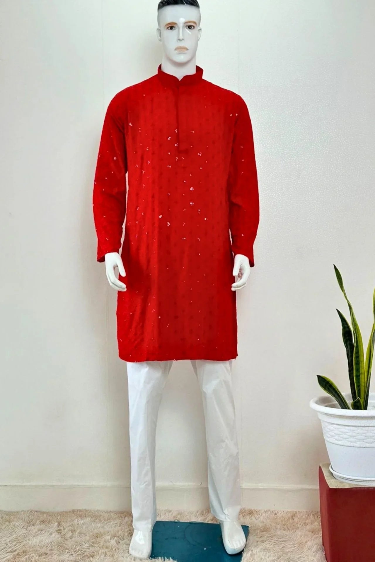 Men's Vibrant Red Chikankari Style Embroidered Kurta