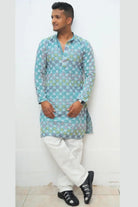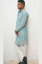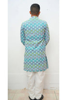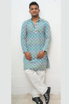 Design: Casual, straight-fit men's Kurta with a simple Mandarin collar and open placket (appears to be a quarter placket). The color palette is dominated by refreshing aqua blue tones.
