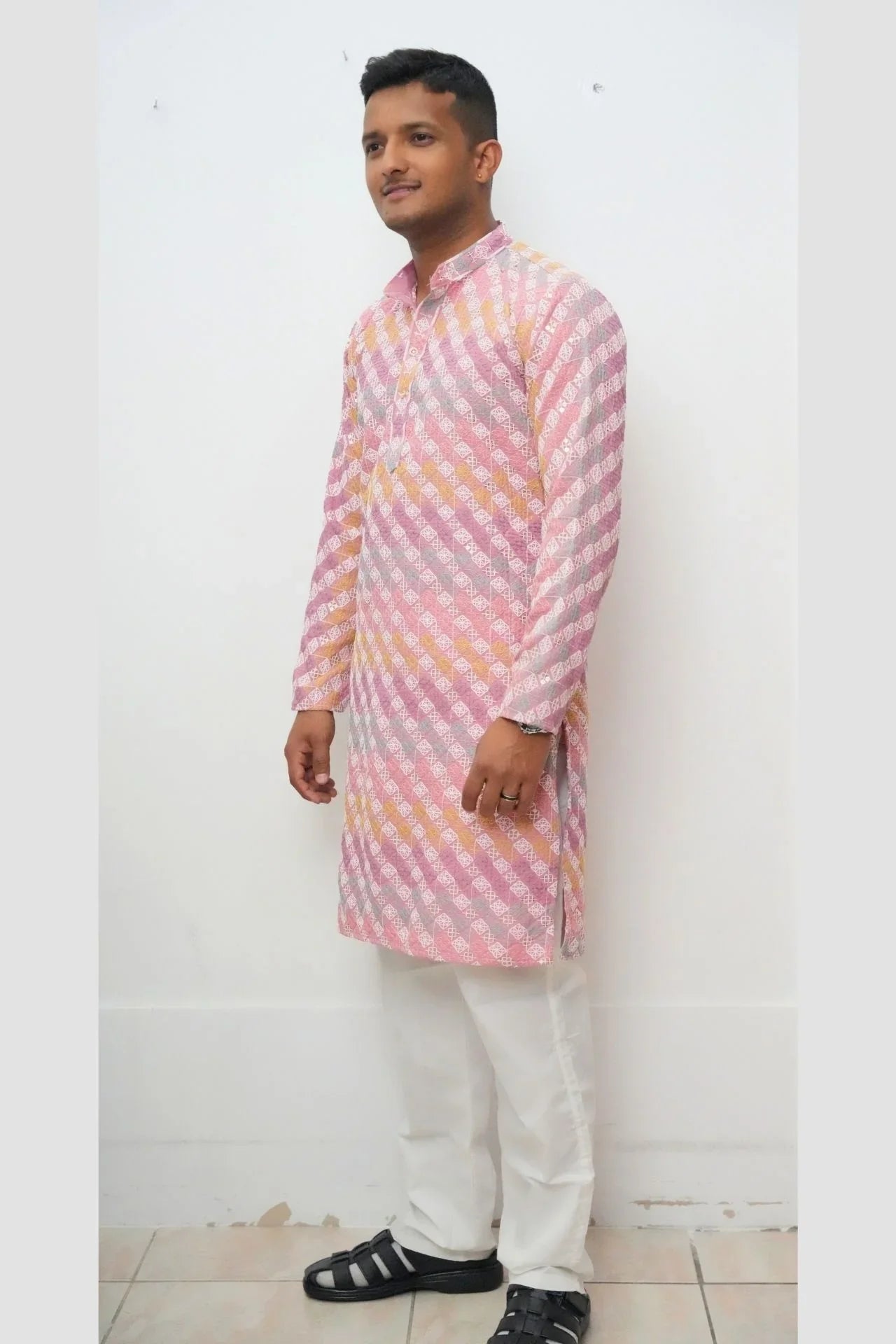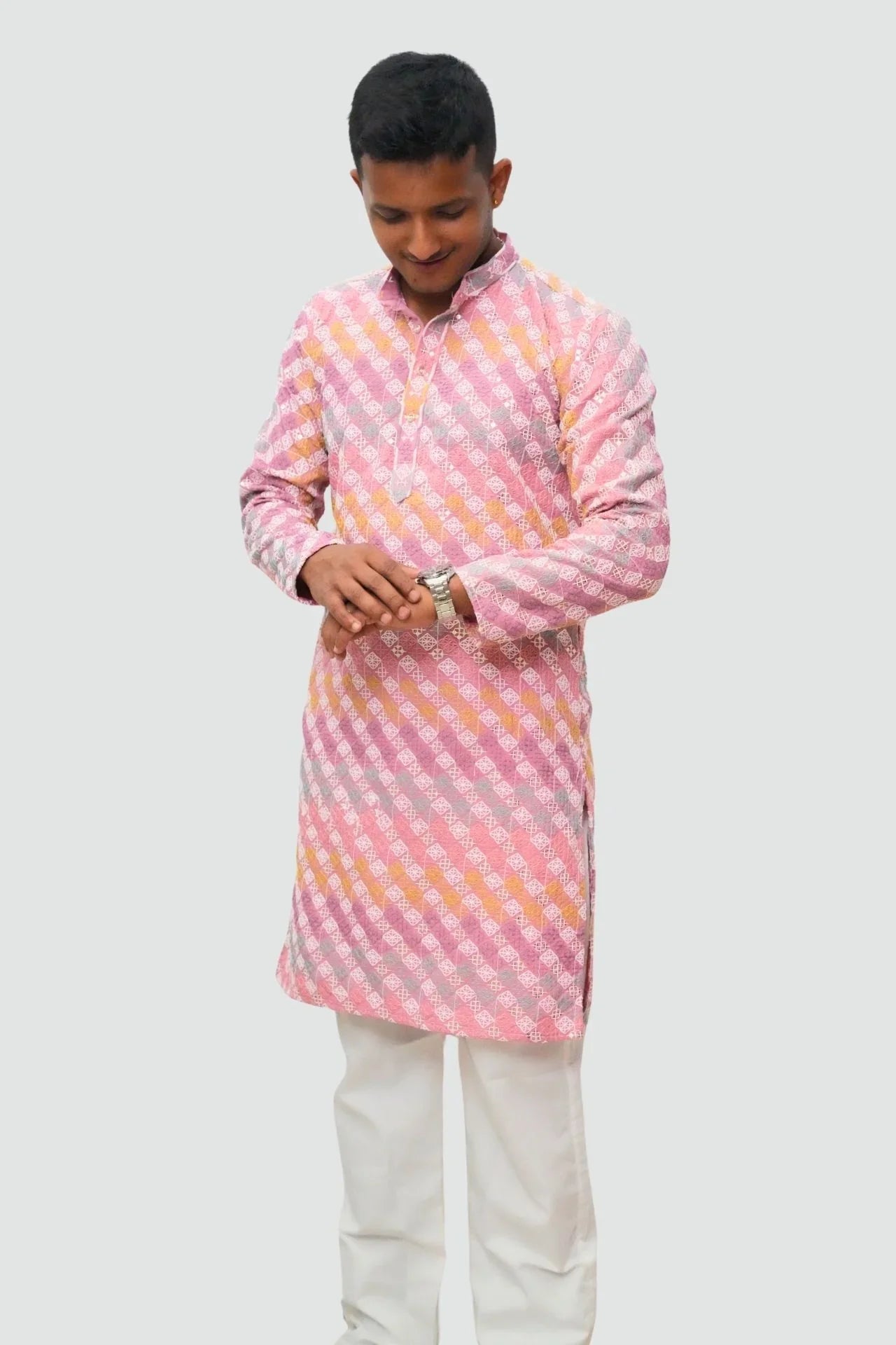 Design: Classic straight-fit men's Kurta with a Mandarin collar and long sleeves. It features a bright, playful blend of pastel colors including pink, yellow, lilac, and light grey.