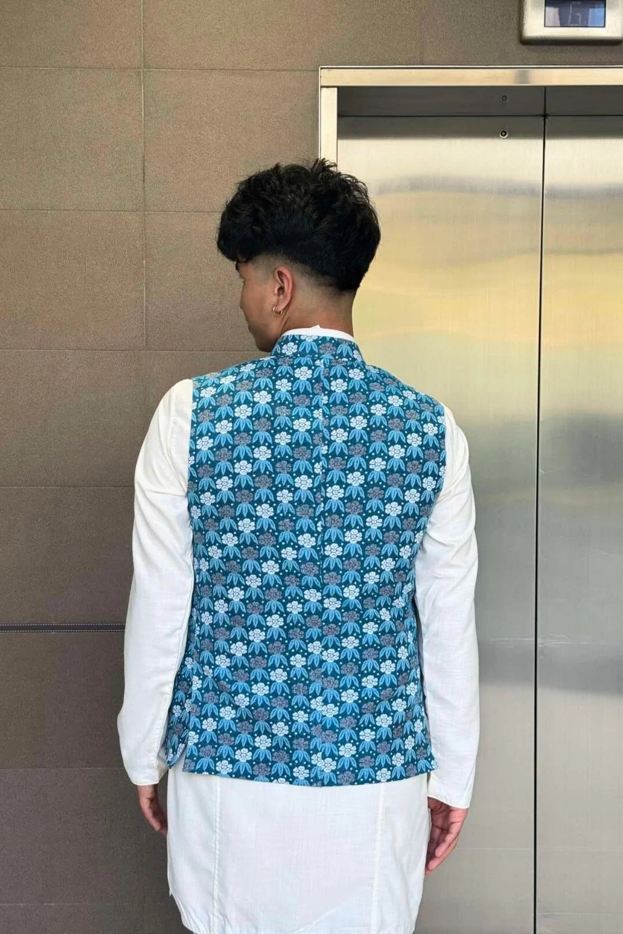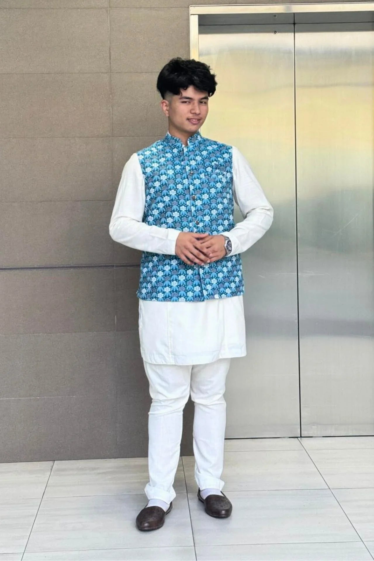 Highlights: The jacket features a vibrant sky blue and teal floral geometric print, offering a striking contrast to the minimalist solid white Daura Suruwal