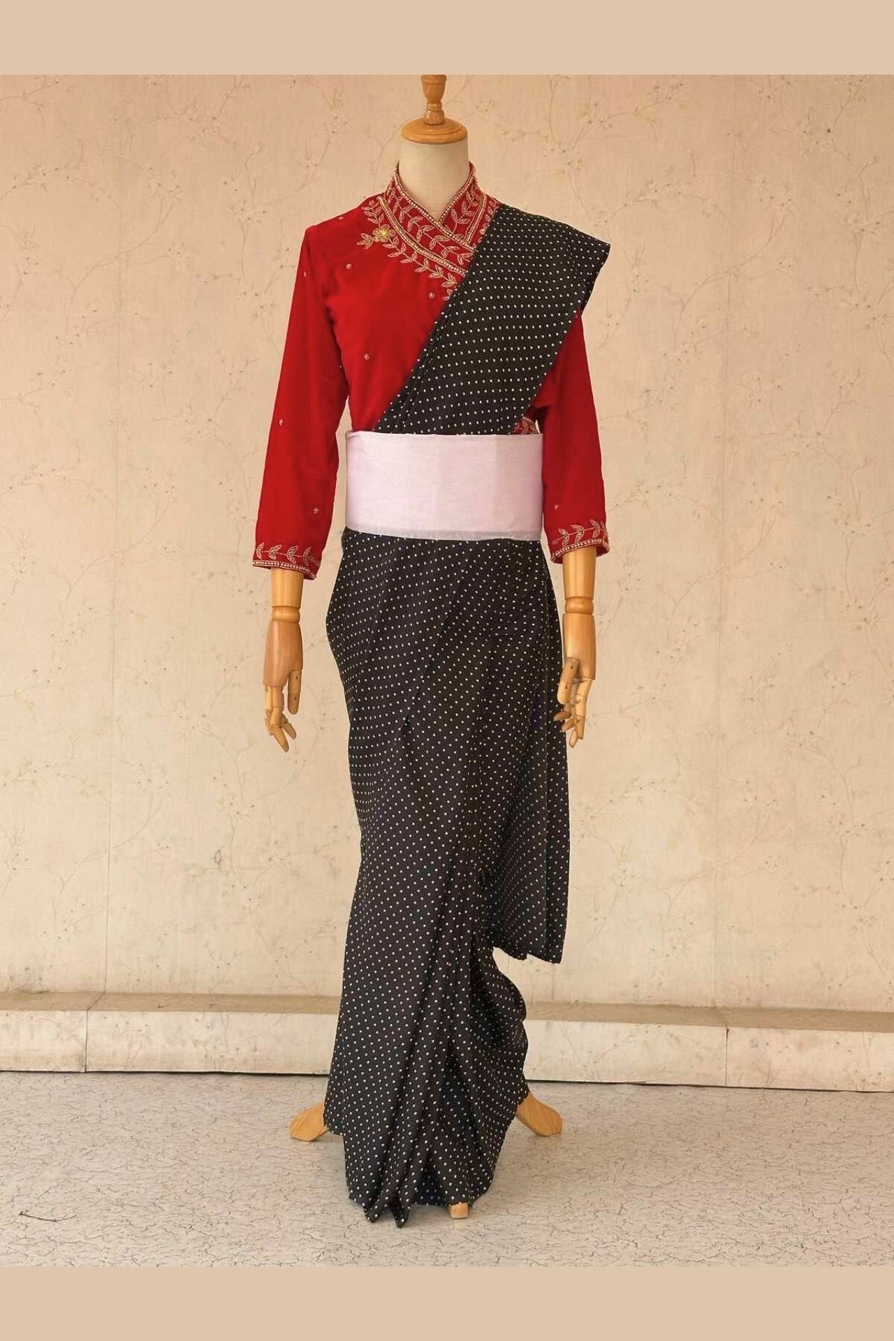 The red blouse features a high, embroidered collar and intricate gold-tone Zari work on the neckline and cuffs. The saree is a dark fabric with a simple, all-over dot print.