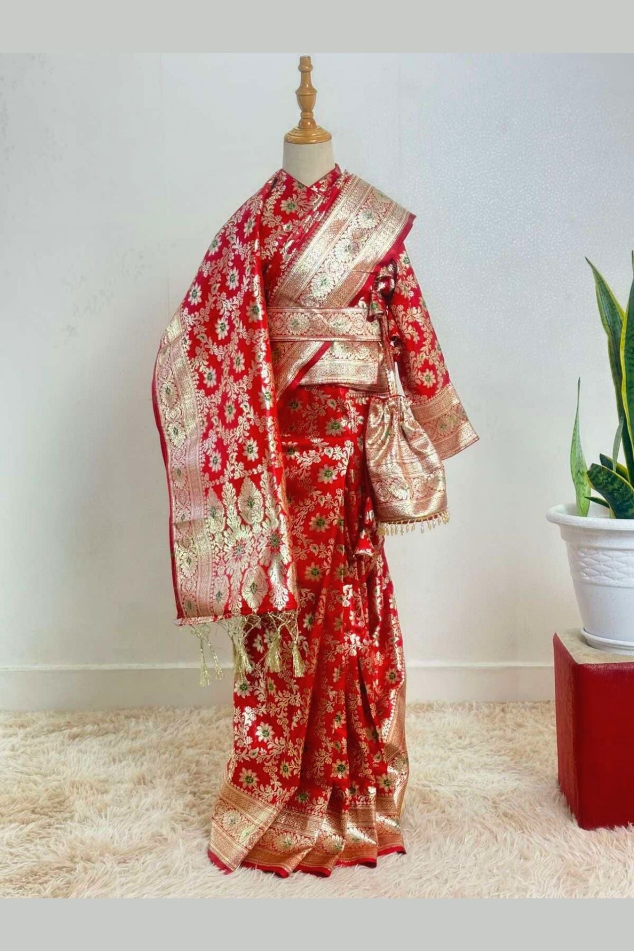 Set includes: 1 Banarasi Saree with attached Blouse, Waist Belt and Polti bag.