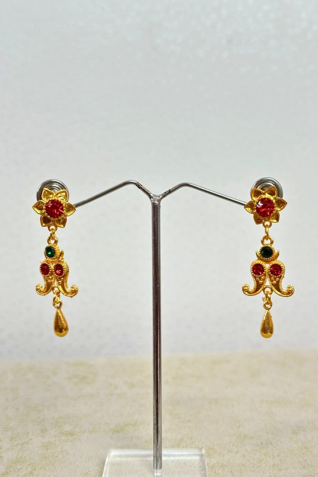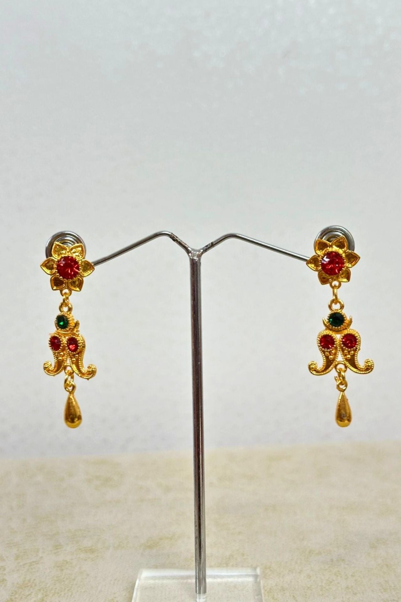 - Single-tiered, short drop style with floral stud