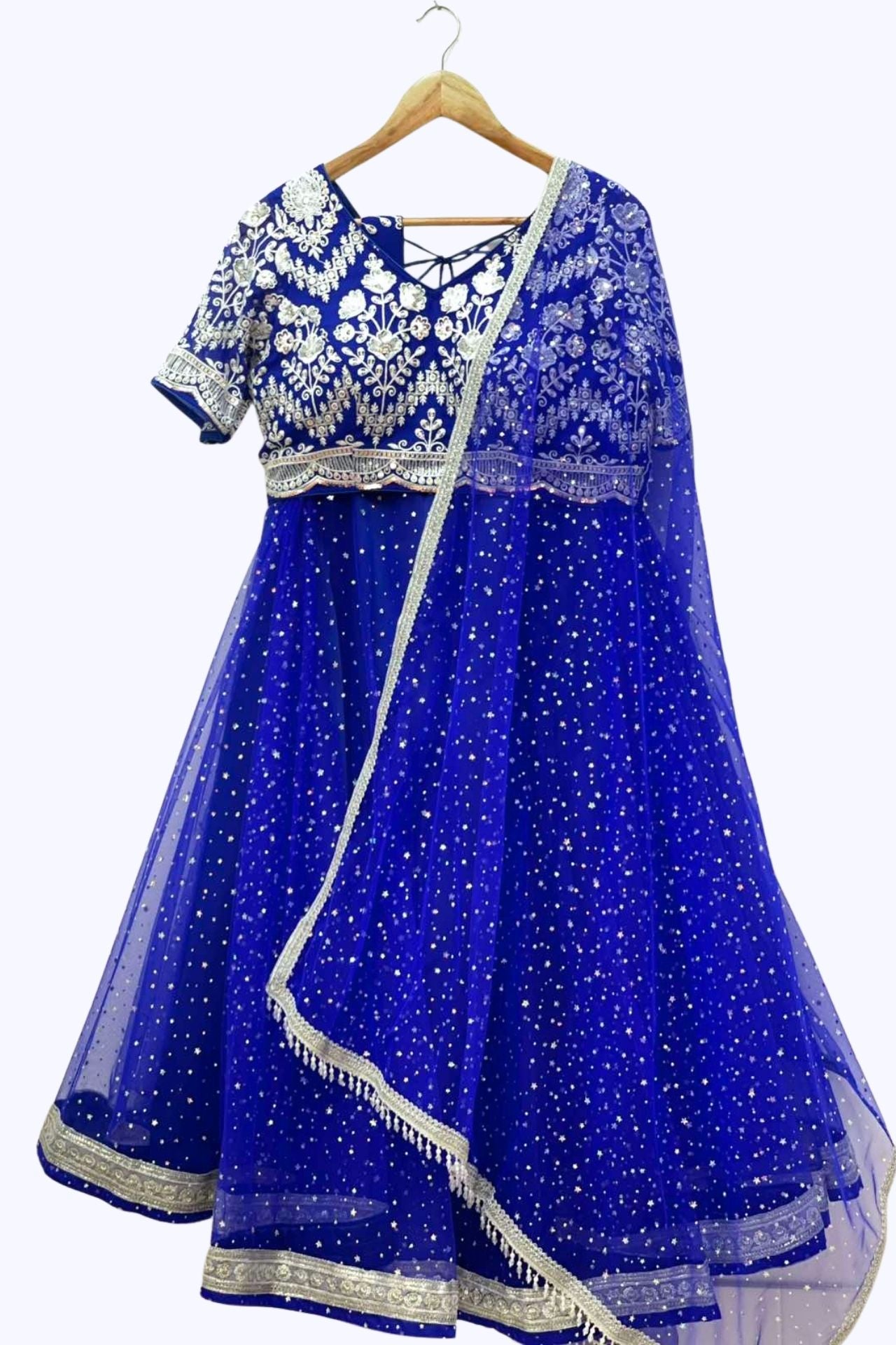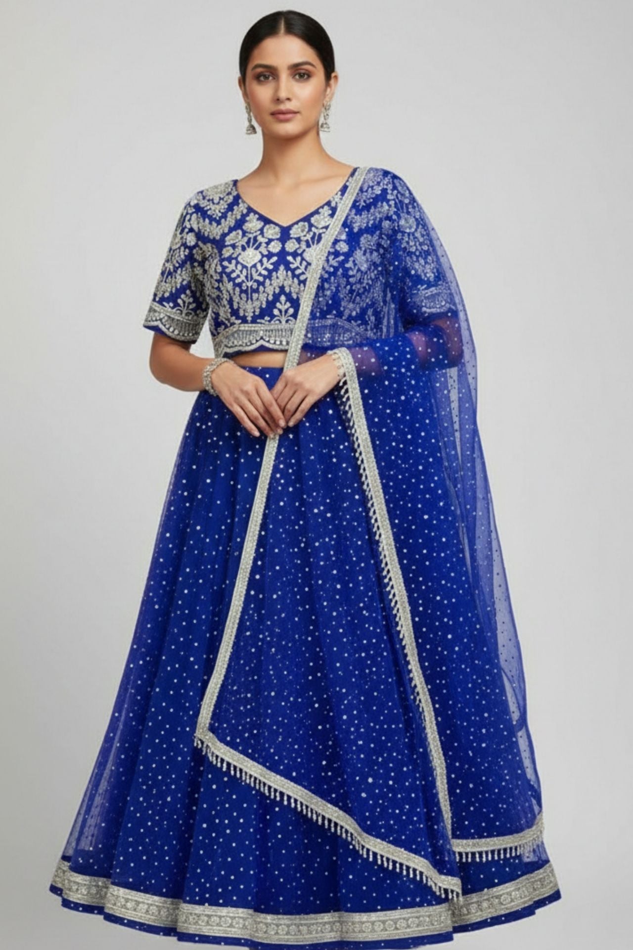 Design: Features a voluminous net lehenga adorned with shimmering stone-like sequins, paired with a heavily embroidered floral blouse and a matching bordered dupatta.