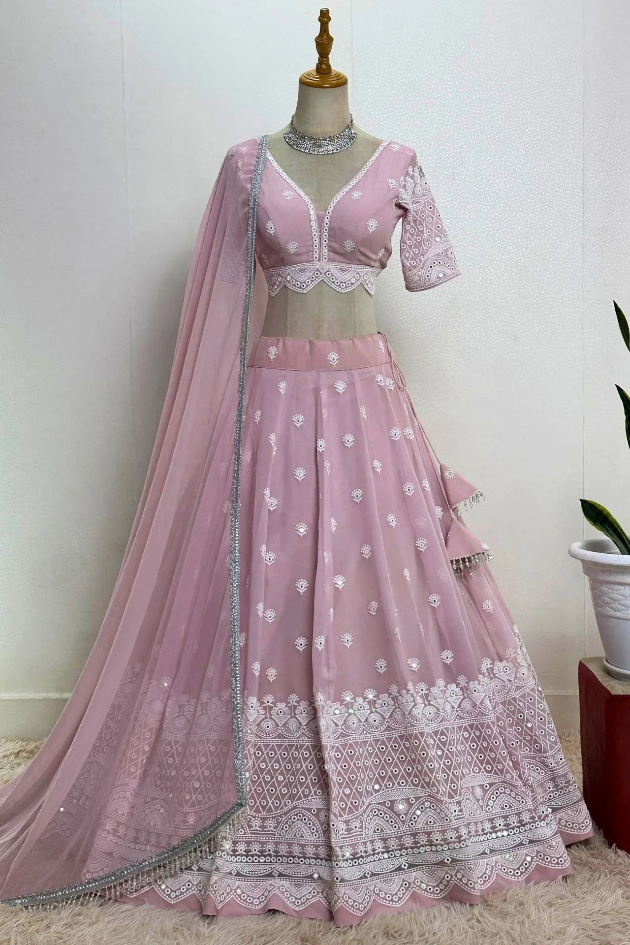 Pink Chikankari & Mirror Work Lehenga Choli Set