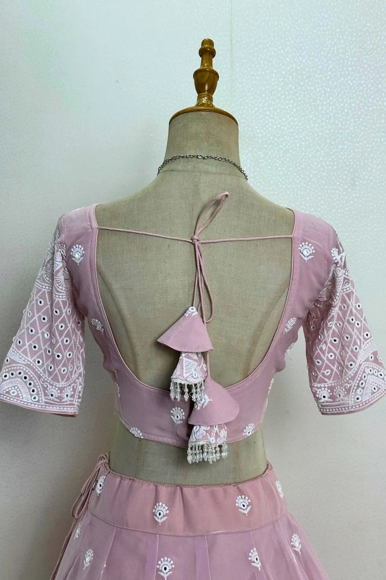 • Chic Blouse: Features a flattering V-neckline and a deep square back with adjustable tasselled tie-up strings (Dori), adorned with delicate white bead tassels.