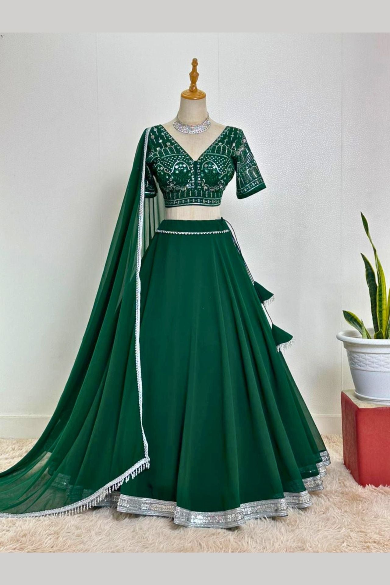Dark Green Georgette Lehenga with Silver Embellished Blouse