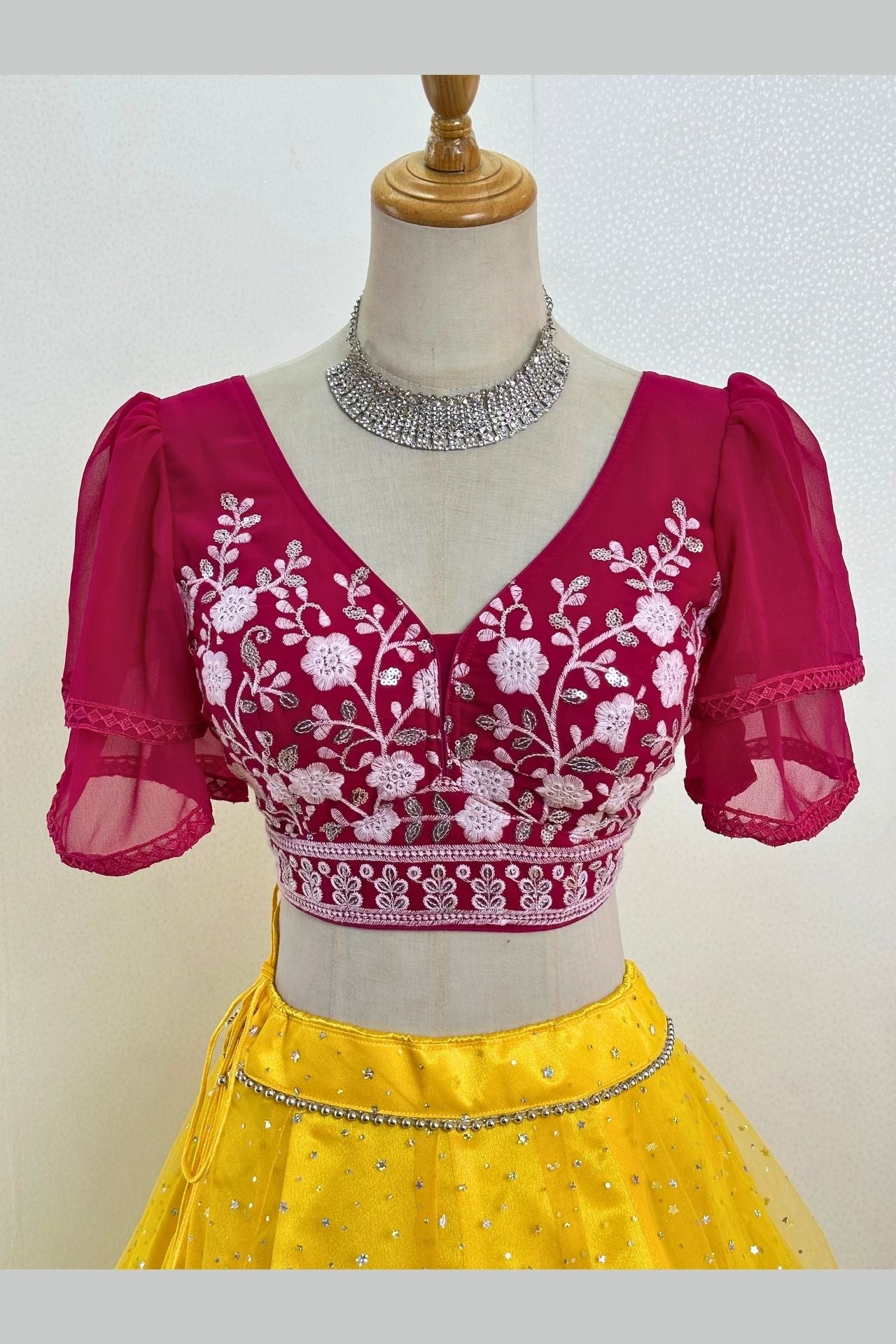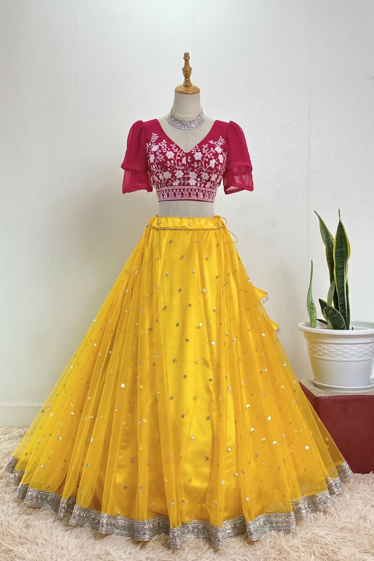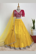 Yellow and pink Net Lehenga Choli