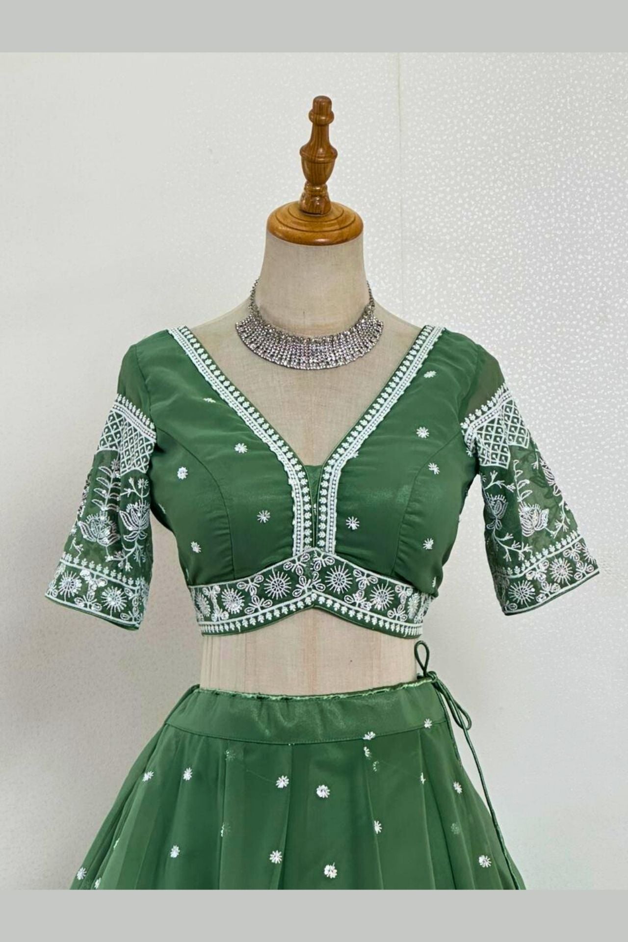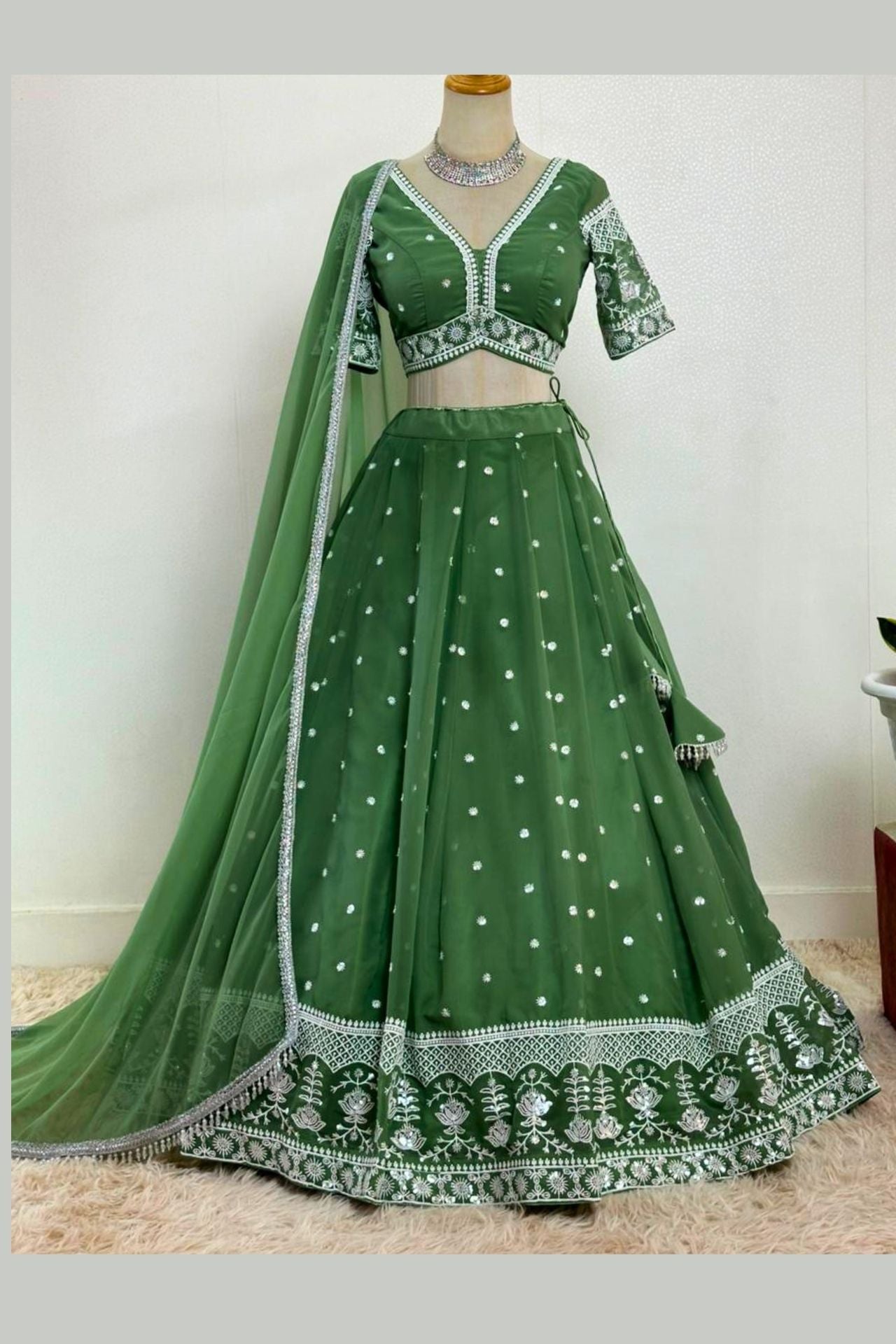 Olive Green Net Lehenga with Intricate Silver Sequin & Zari Border
