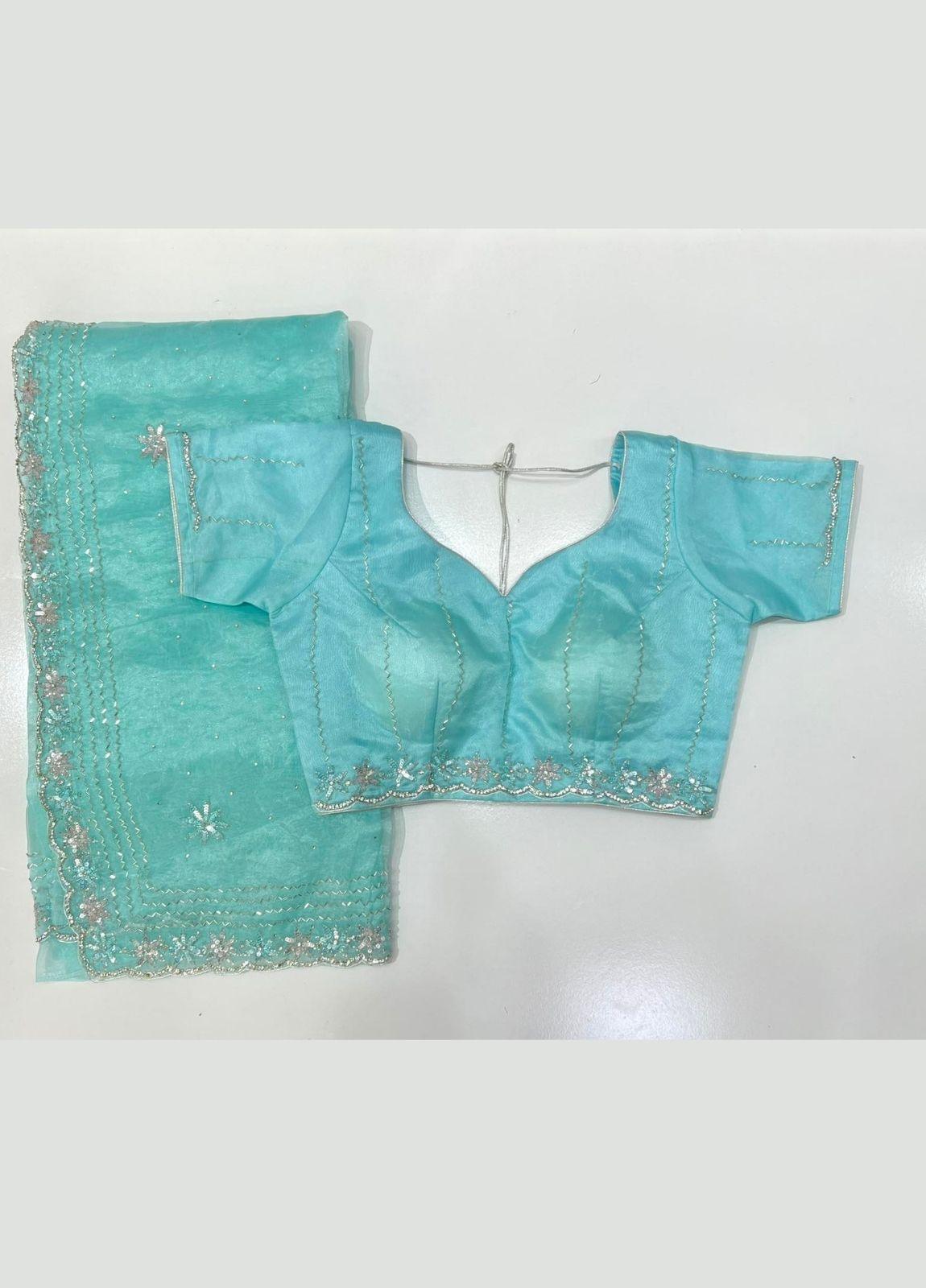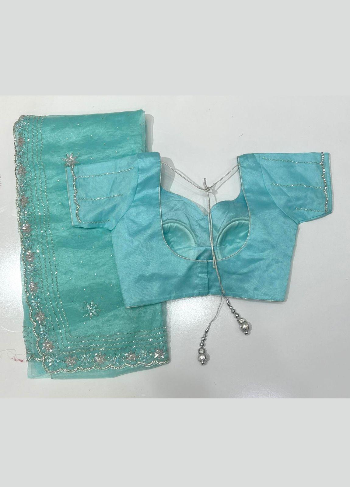 Glass Silk Saree And Radymade Blouse Set In Skyblue