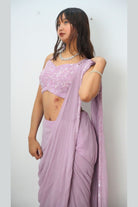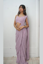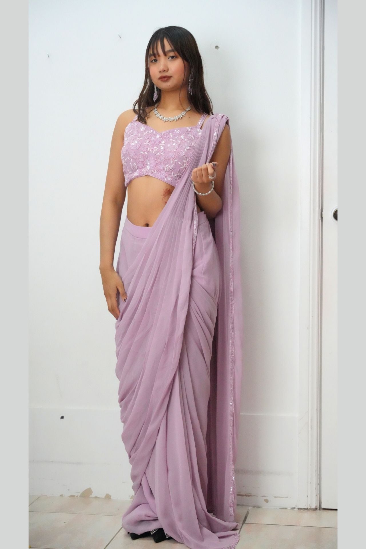 Design: Modern plain flowing drape saree designed for easy pleating; contemporary sleeveless blouse with intricate embroidery and spaghetti straps; low-rise drape style.