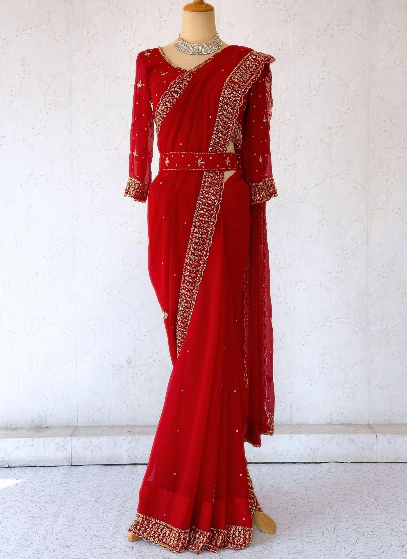 Experience the exquisite craftsmanship of the Georgette Handwork Saree with stone work all over saree.