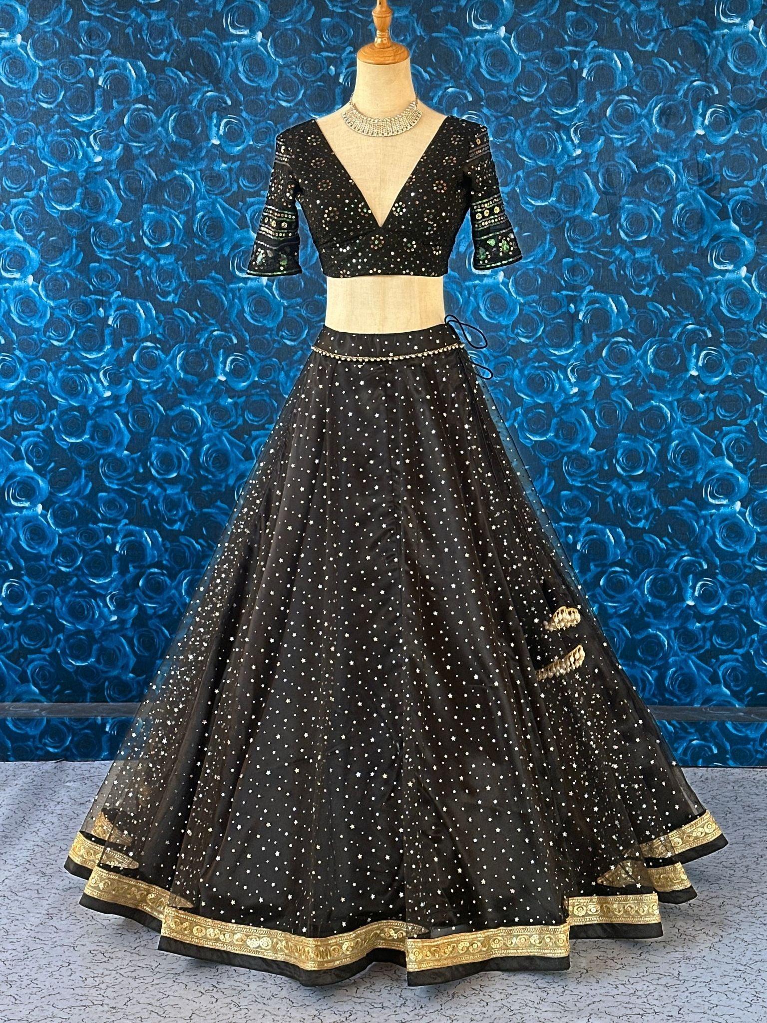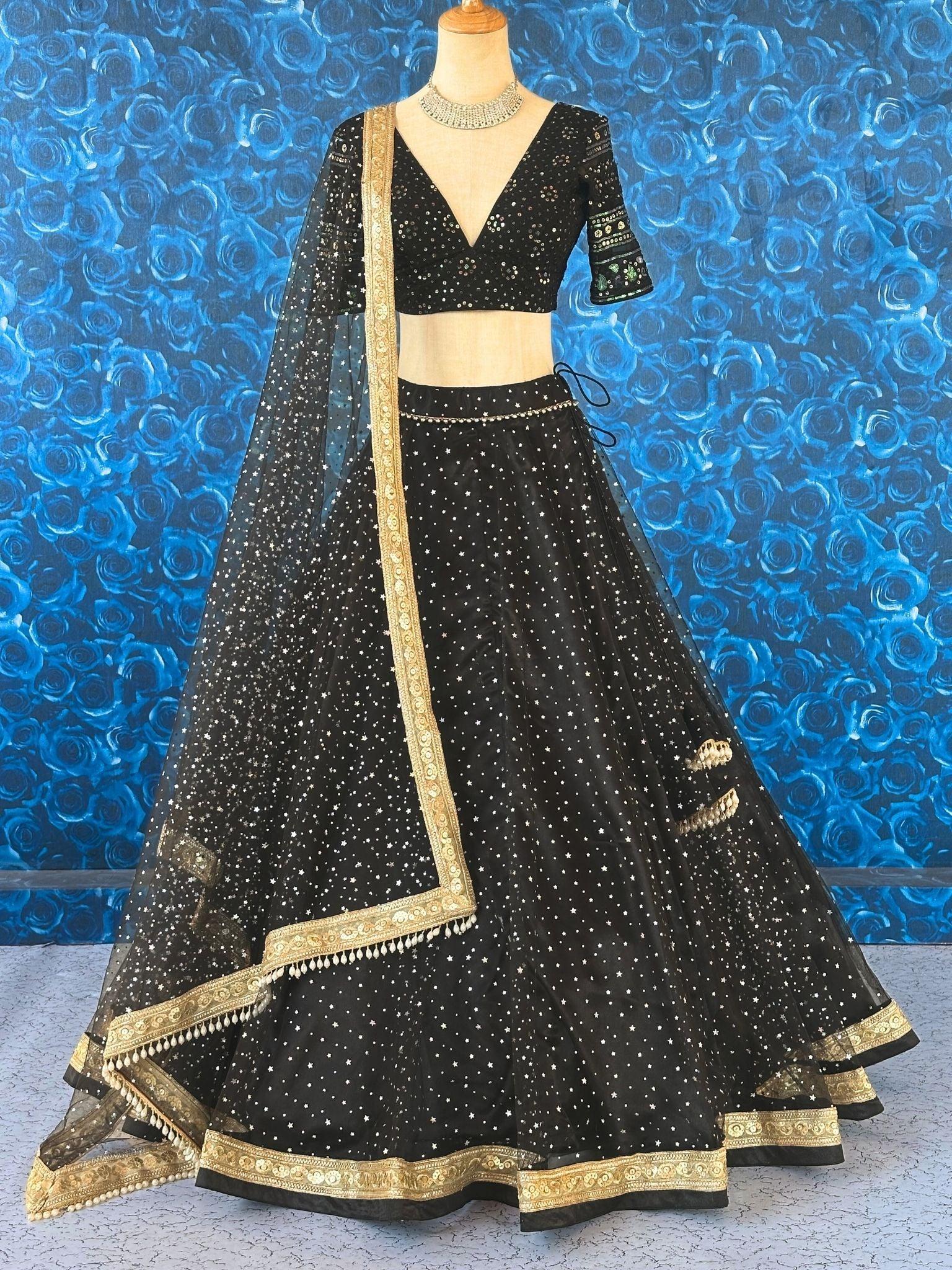1 four layers thread embroidered lehenga (Outer fabrics in Net, 2 inner fabrics soft silk and crape, one cancan (hardnet). Lehenga Skirt has string with tassel for Adjustment of waist.