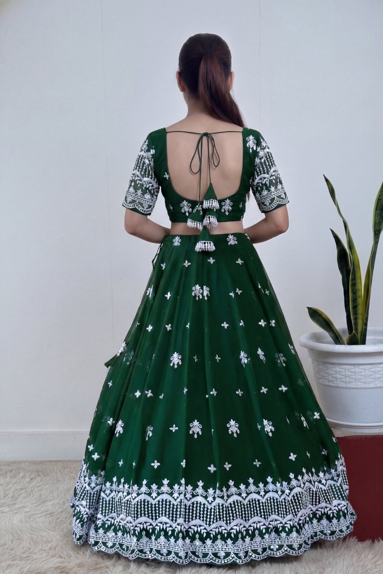 1 four layers thread embroidered lehenga (Outer fabrics in Georgette, 2 inner fabrics soft silk and crape, one cancan (hardnet). Lehenga Skirt has string with tassel for Adjustment of waist.