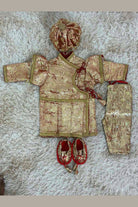 Design: Traditional woven brocade pattern with side-tie tassels and gold beaded lace detailing on the sleeves and hem