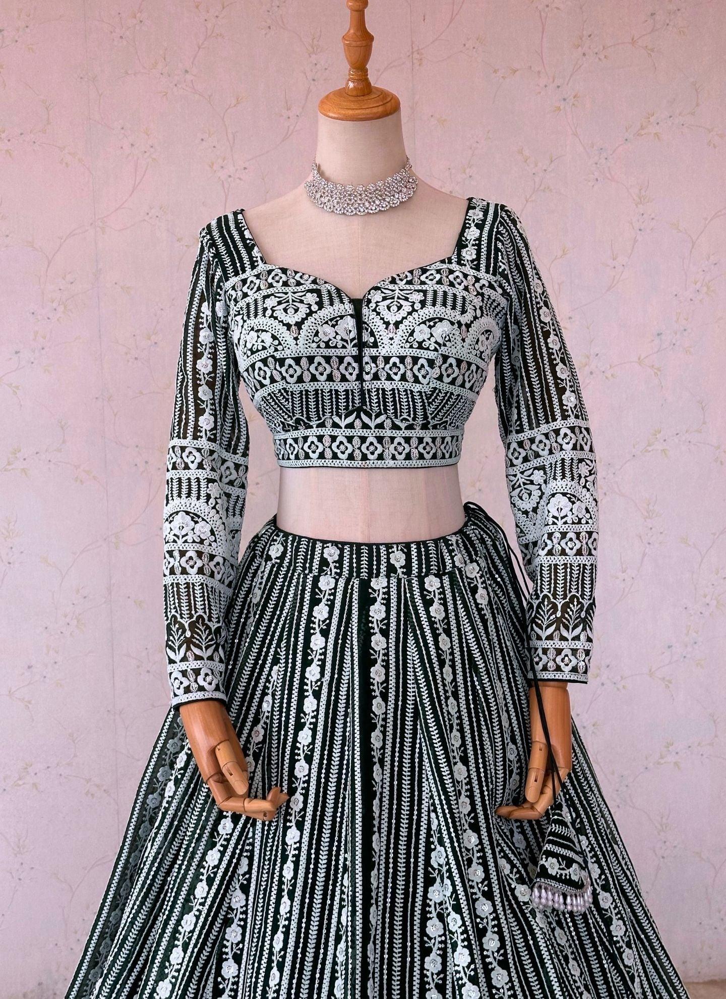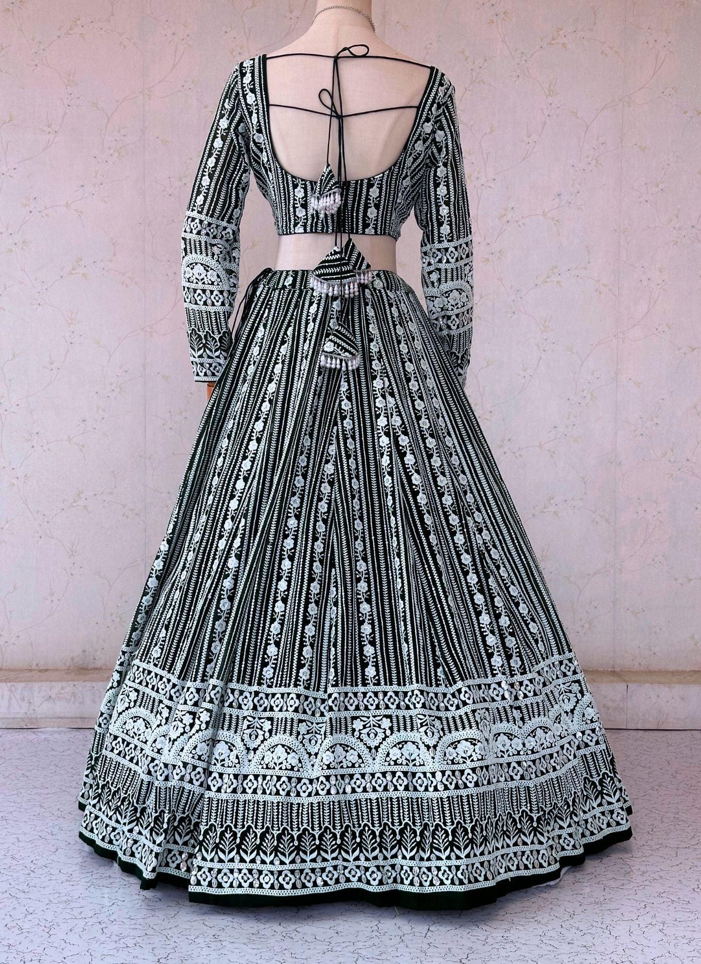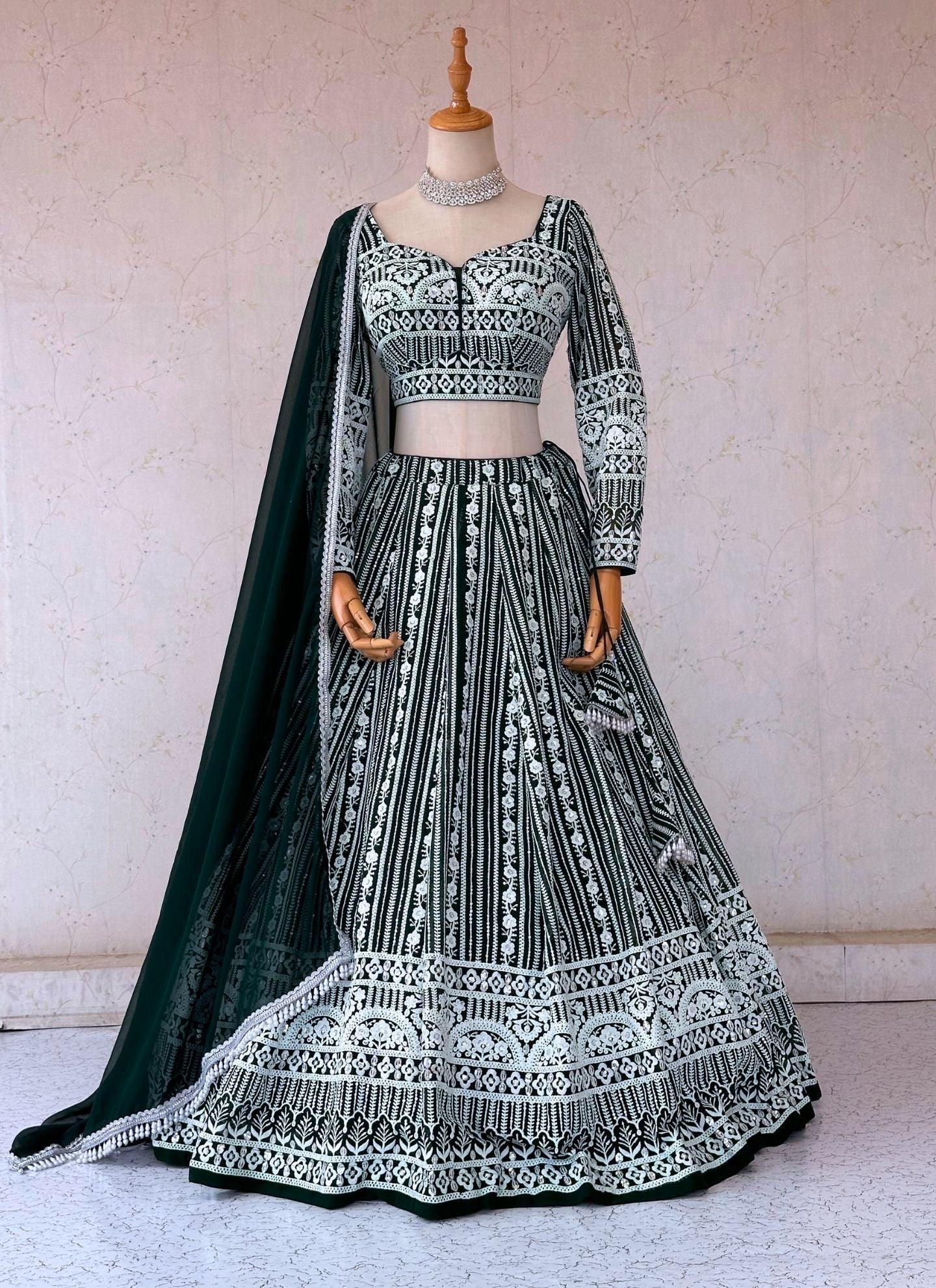 1 four layers thread embroidered lehenga (Outer fabrics in Georgette, 2 inner fabrics soft silk and crape, one cancan (hardnet). Lehenga Skirt has string with tassel for Adjustment of waist.