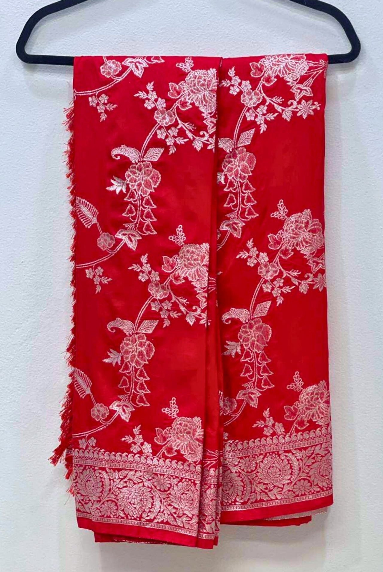 Banarasi Silk Saree: Distinguished by gold embroidery, crafted from premium Banarasi silk through intricate handweaving.