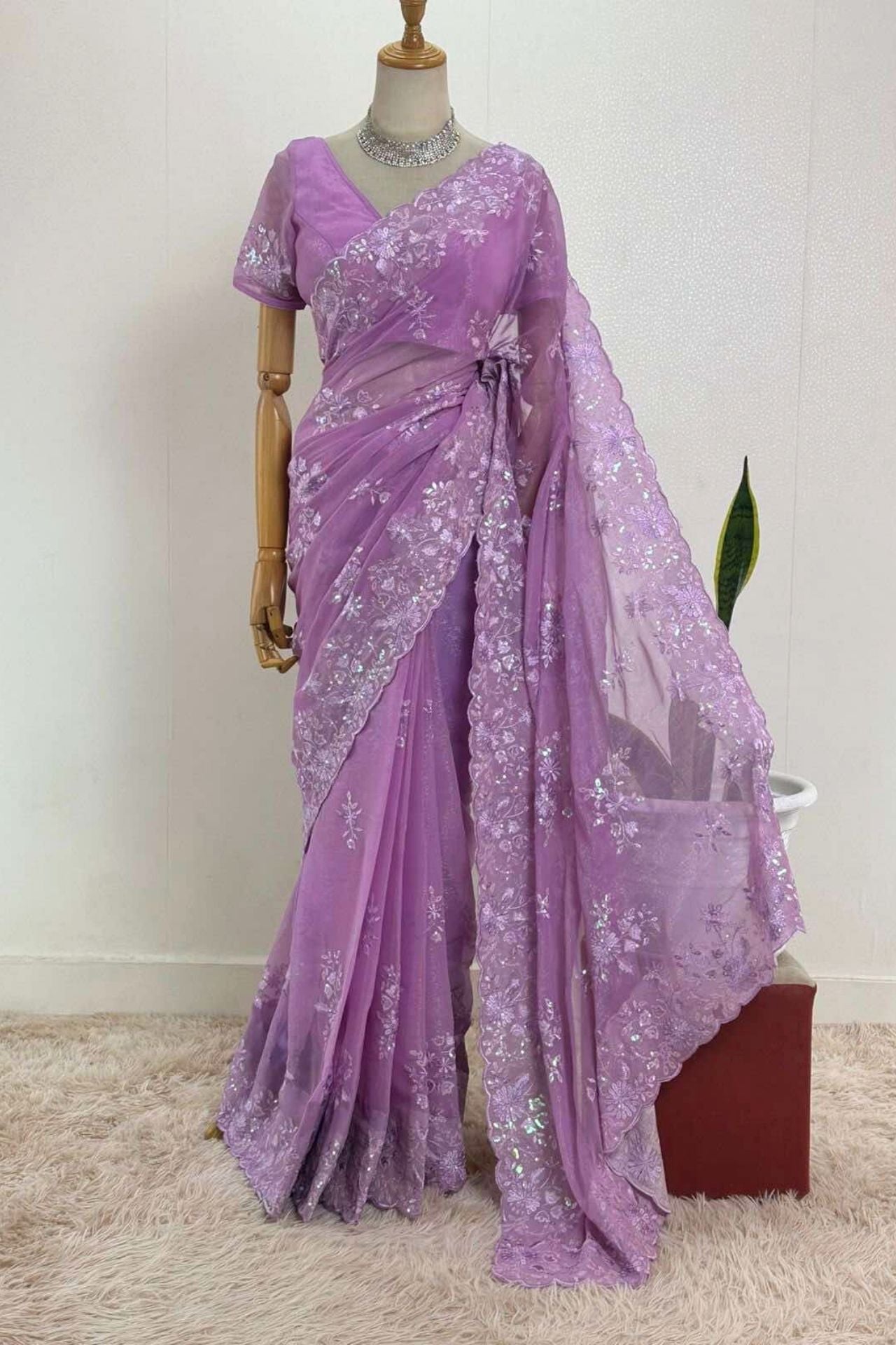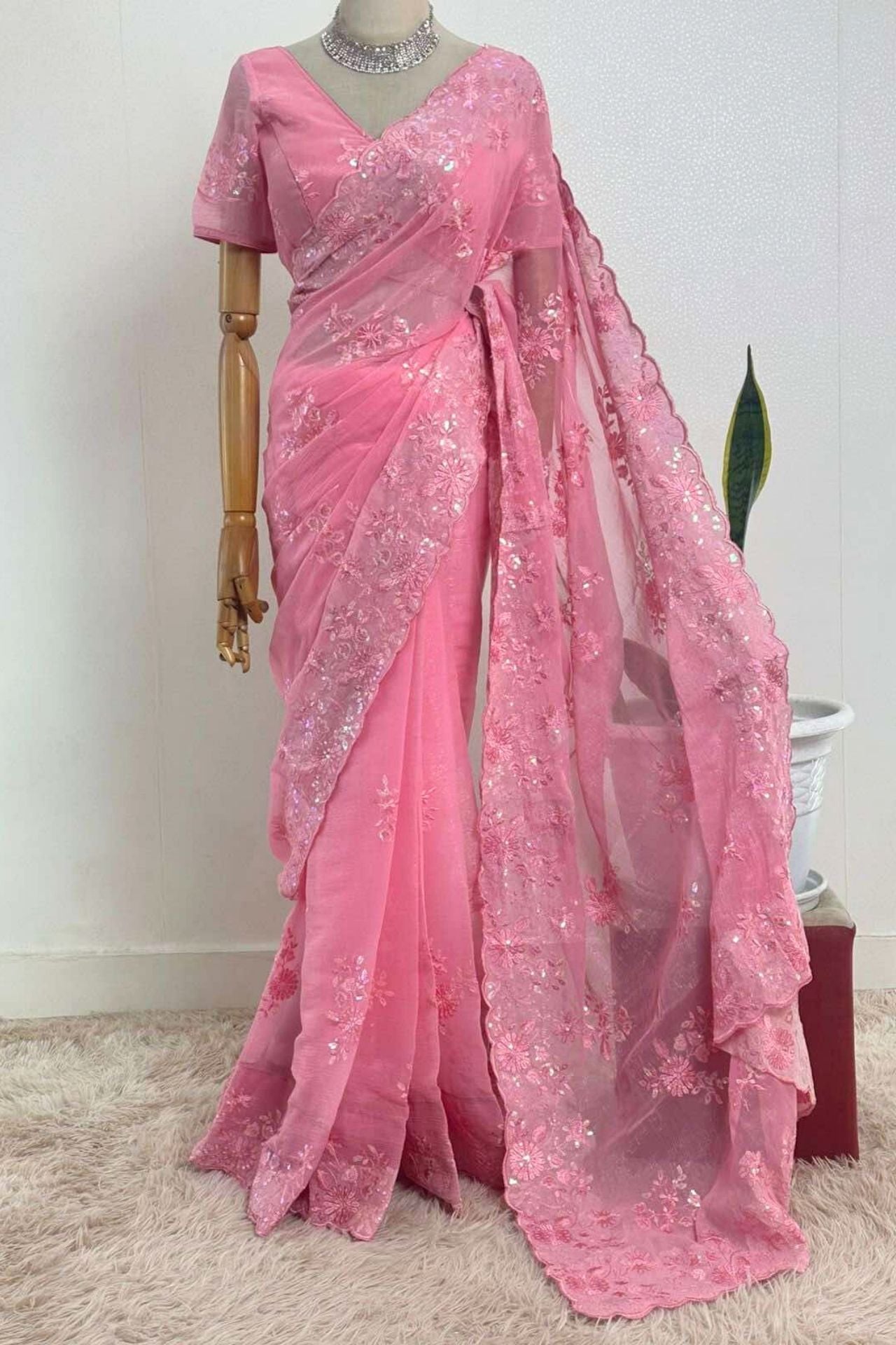 Chikankari Saree: Showcasing exquisite embroideries, utilizing fabrics embellished with appealing decoration styles.