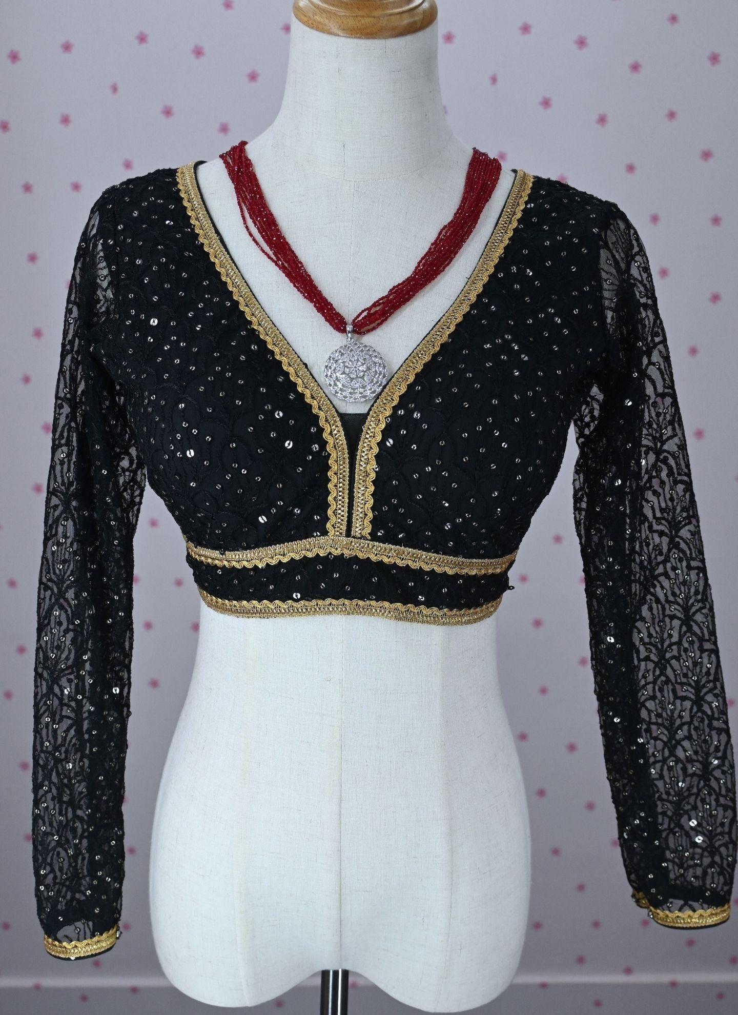 - Fullsleeves blouse Gold patchwork sequence work with net fabric around the sleeves.