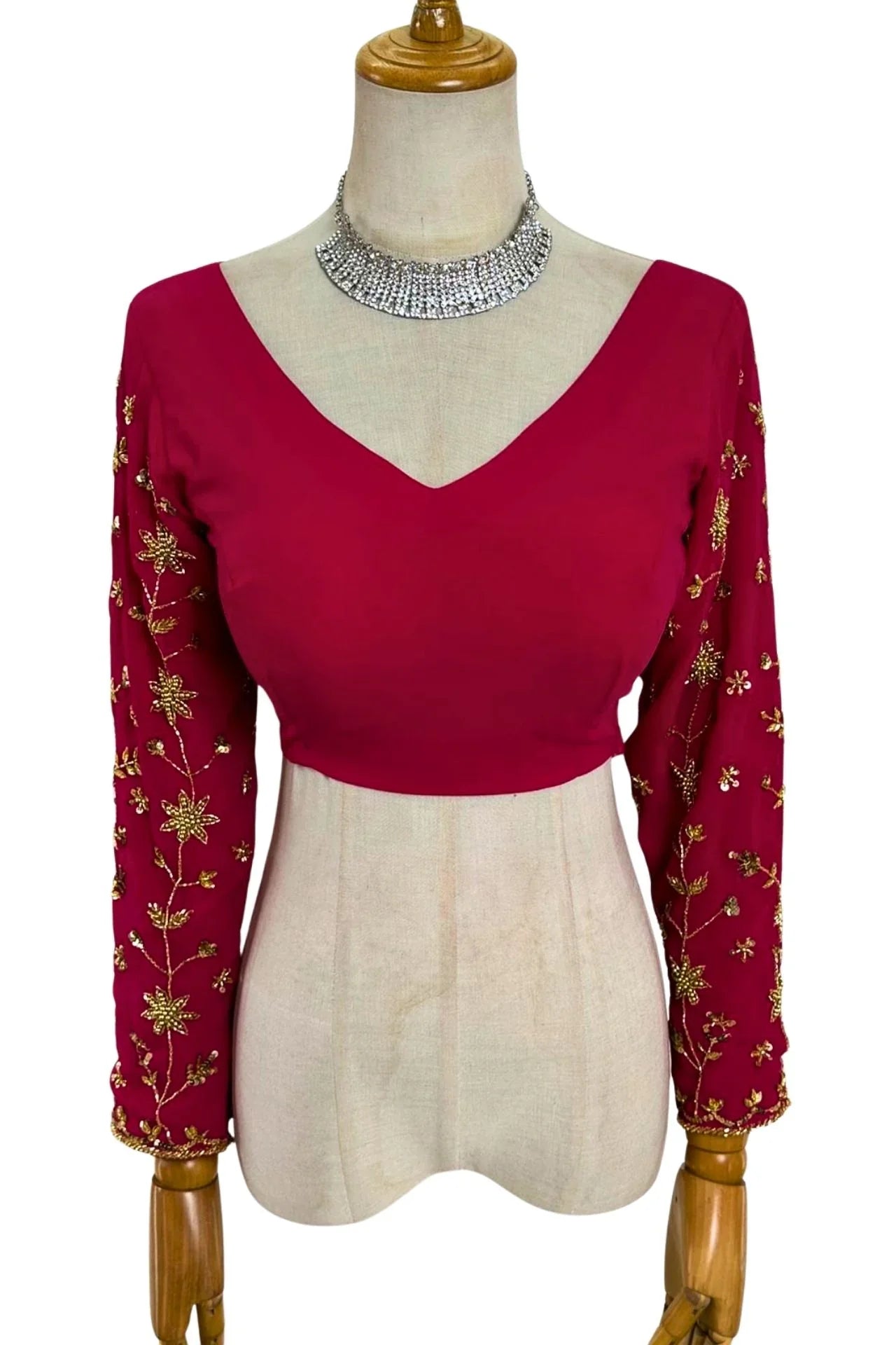 - Design: An elegant raspberry-red blouse with full-length sleeves. The plain body provides a chic contrast to the intricately embroidered sleeves, which feature a beautiful vine-like pattern.