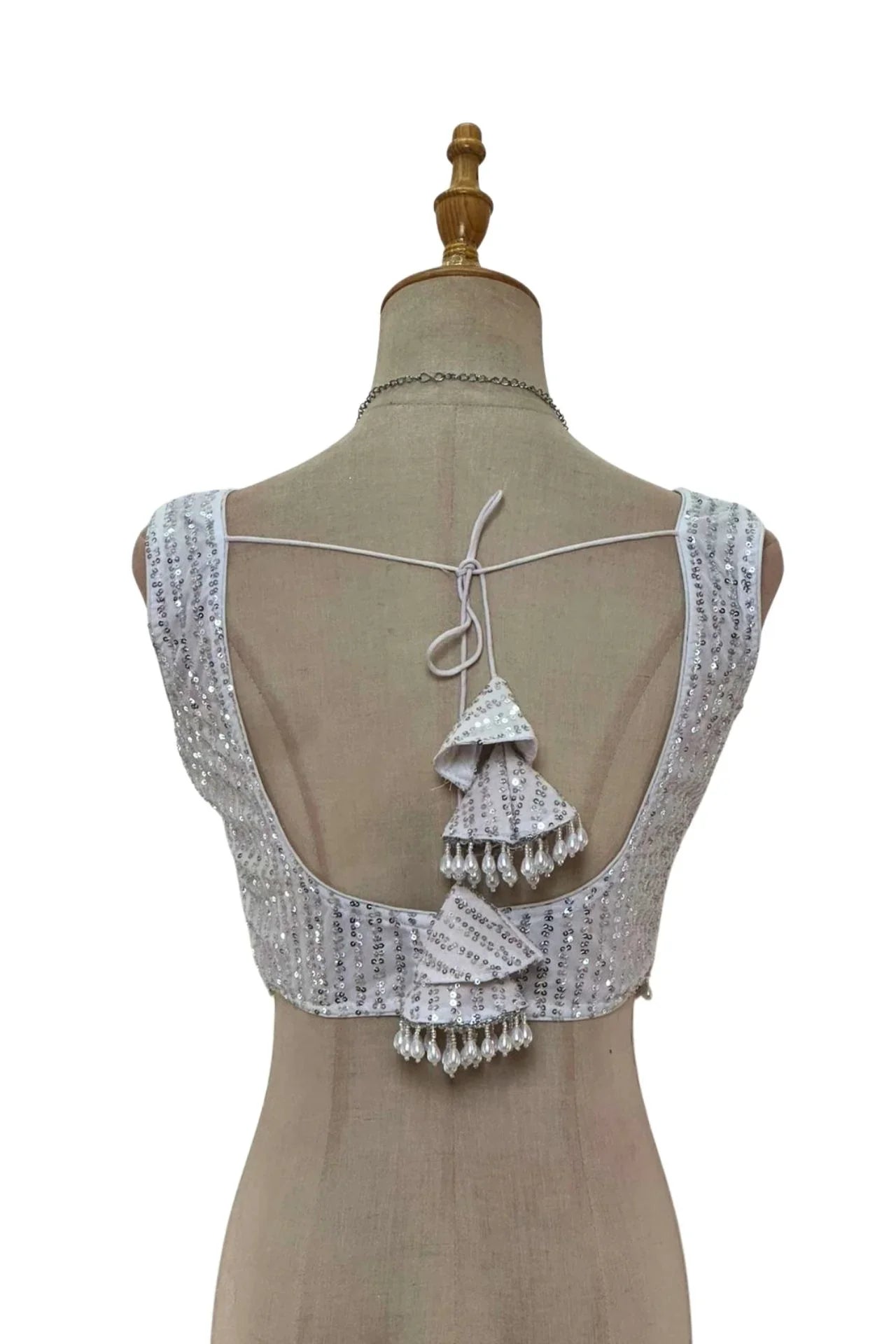 - Highlights: The blouse is a work of art, with an all-over intricate sequin pattern creating a shimmering effect. The hemline is adorned with a delicate dangling pearl fringe, adding a graceful, feminine touch. The back tie-up features tiered tassels decorated with pearls, enhancing the overall elegance.