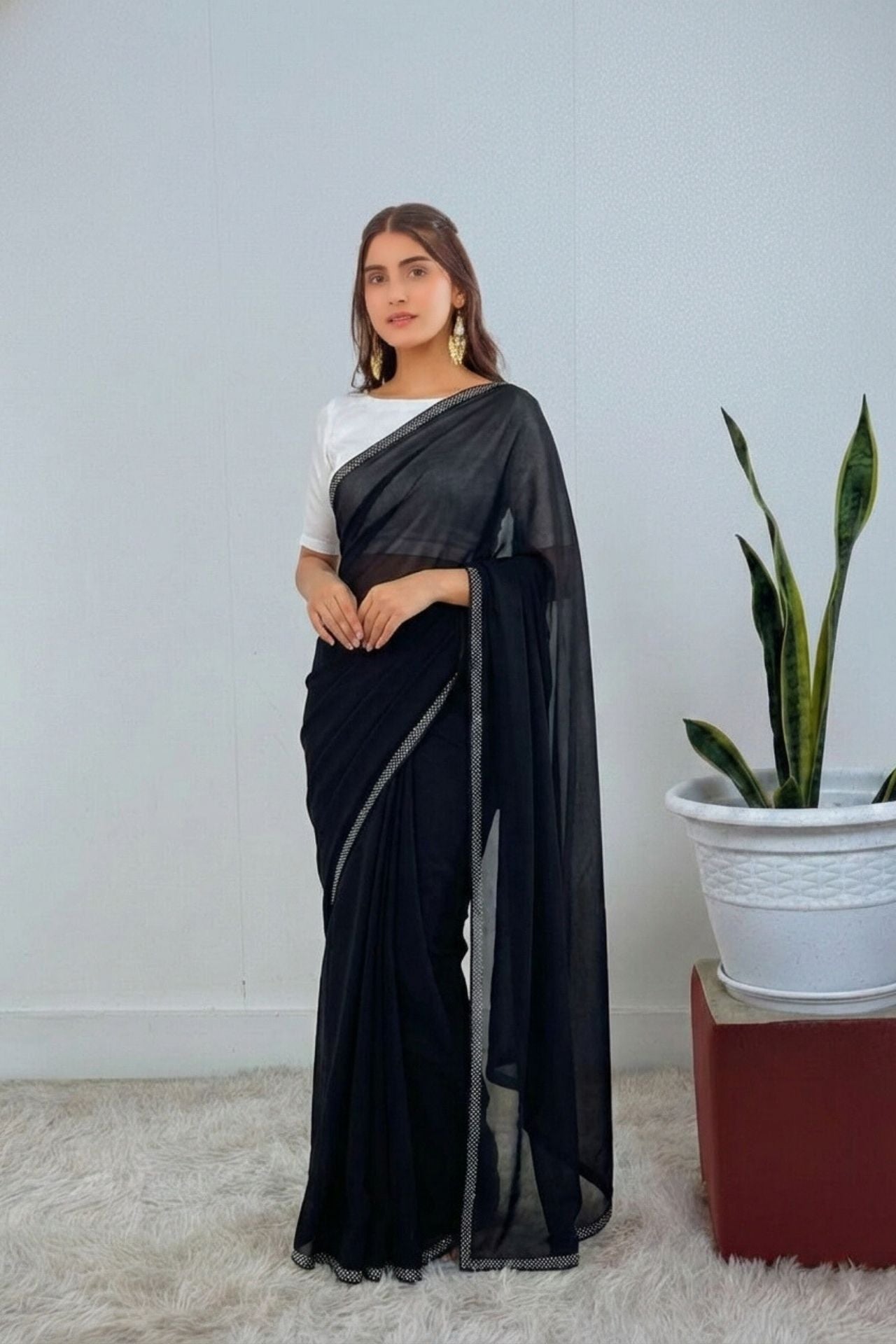 Black Georgette Saree Stone Border Work