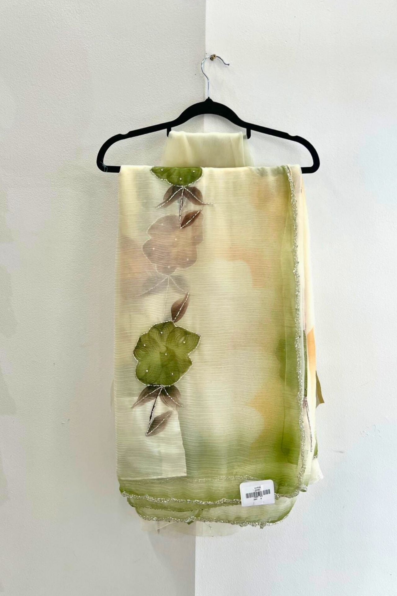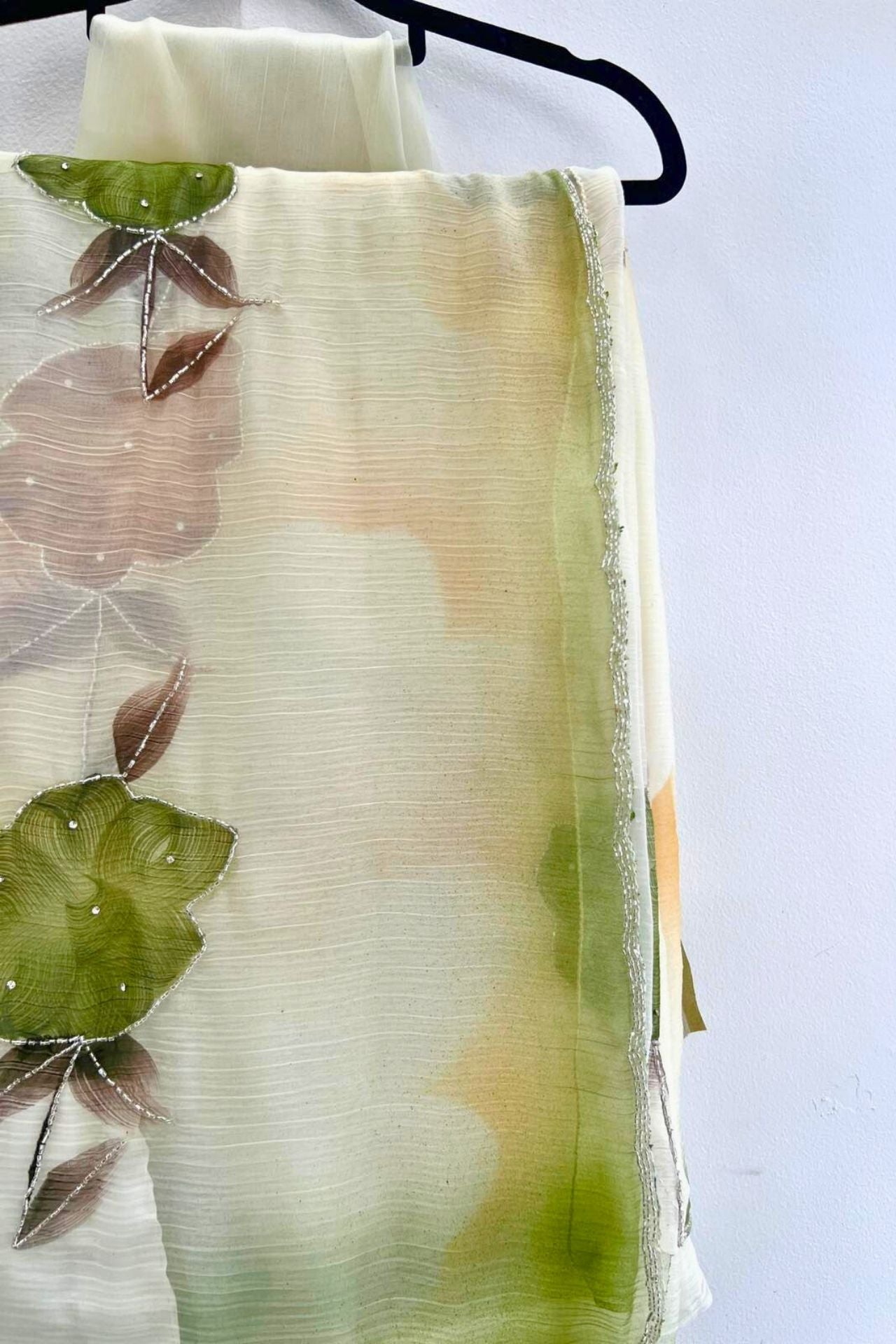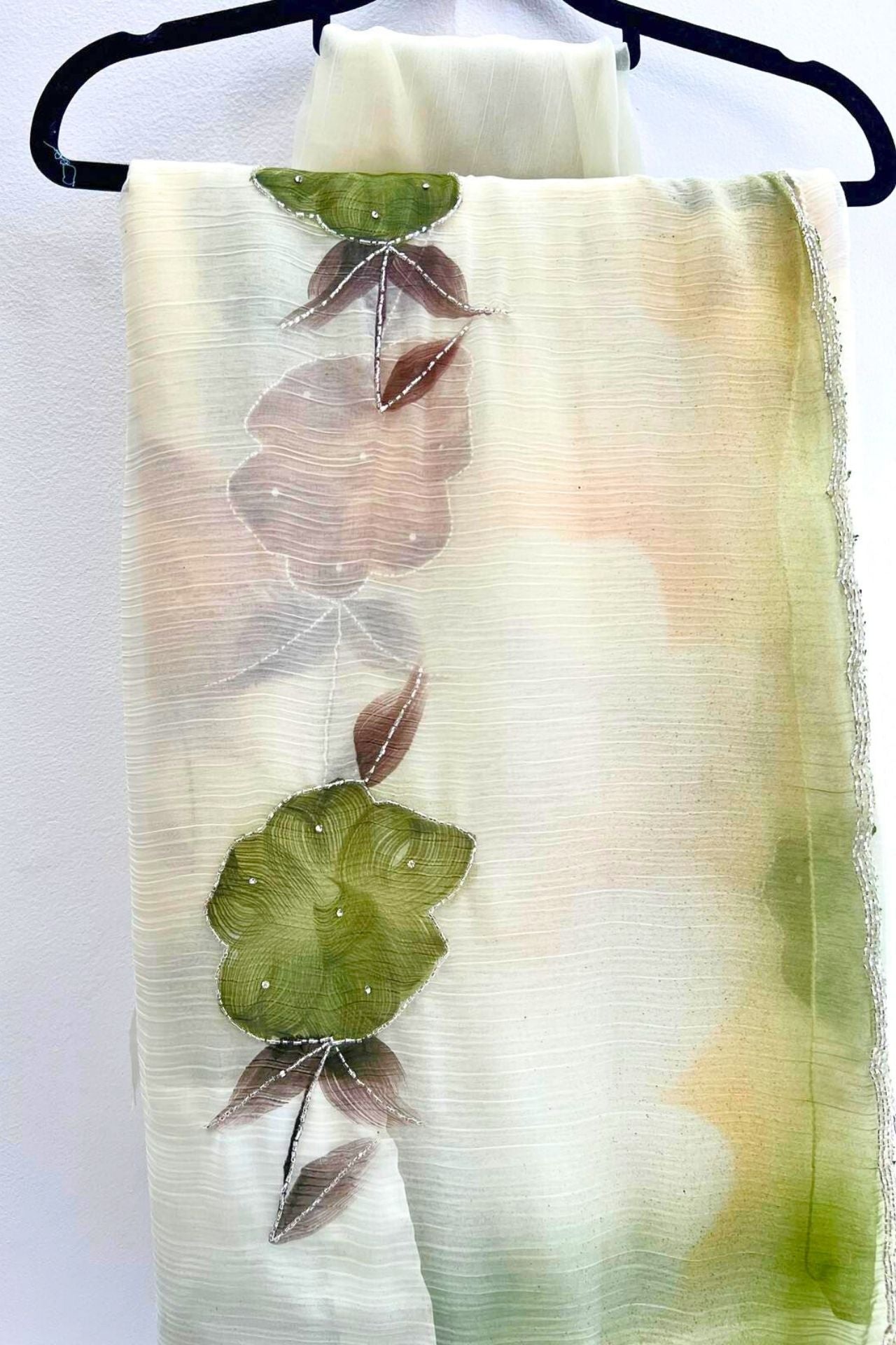 Ivory Saree with Olive & Earth Floral Appliqués and Beaded Border