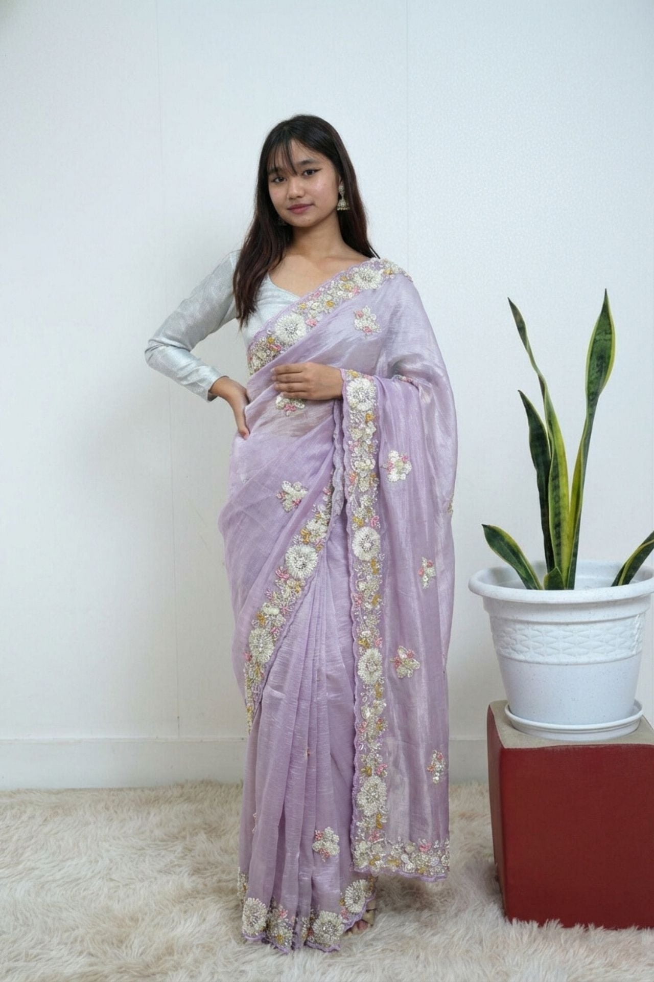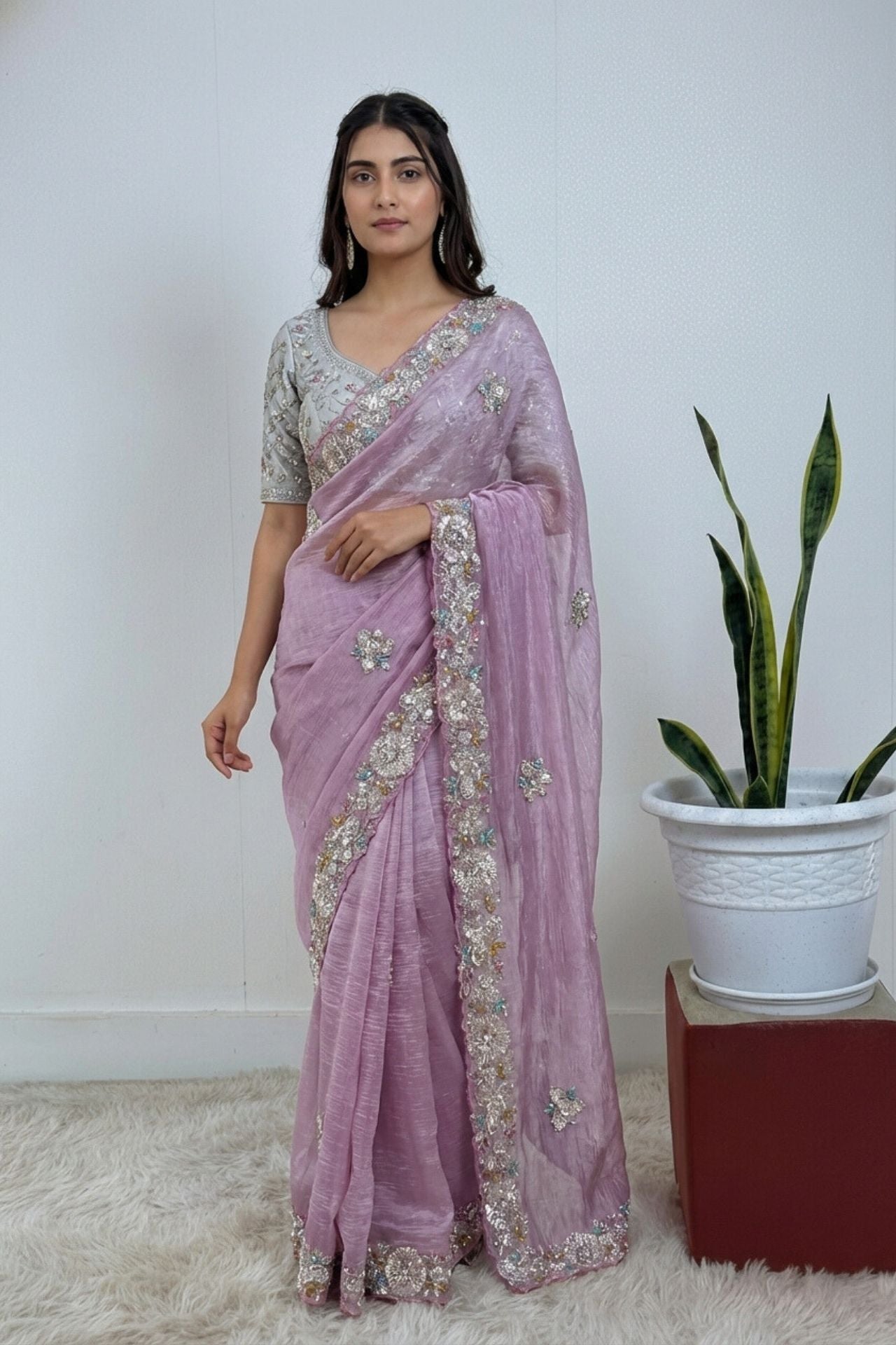 Lavender Organza Saree Floral Sequin Border
