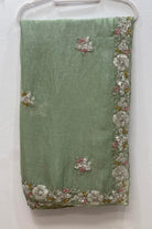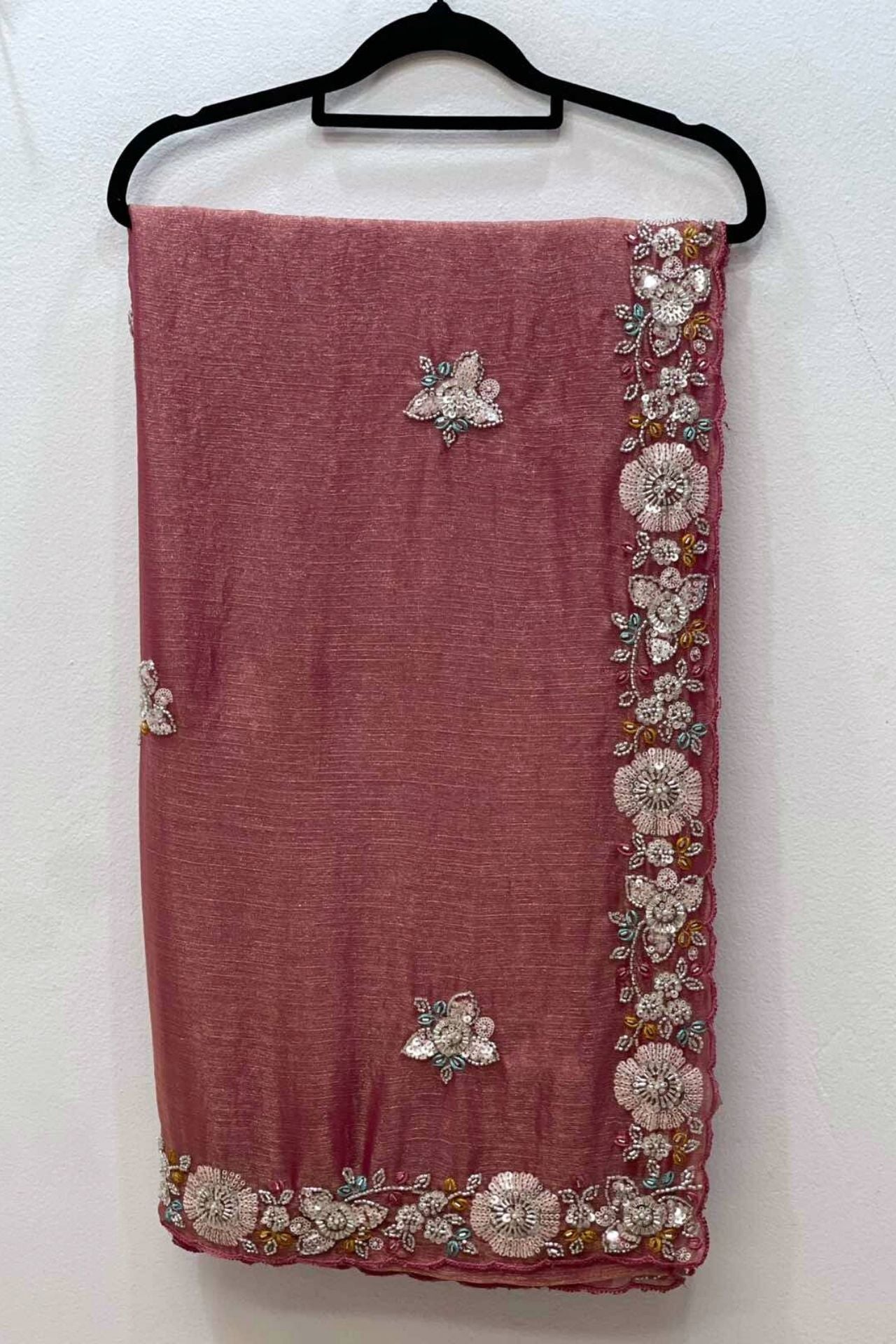 • Design: Features a rich floral border intricately detailed with silver sequins, beads, and subtle hints of turquoise and gold, paired with delicate floral motifs across the body.