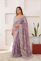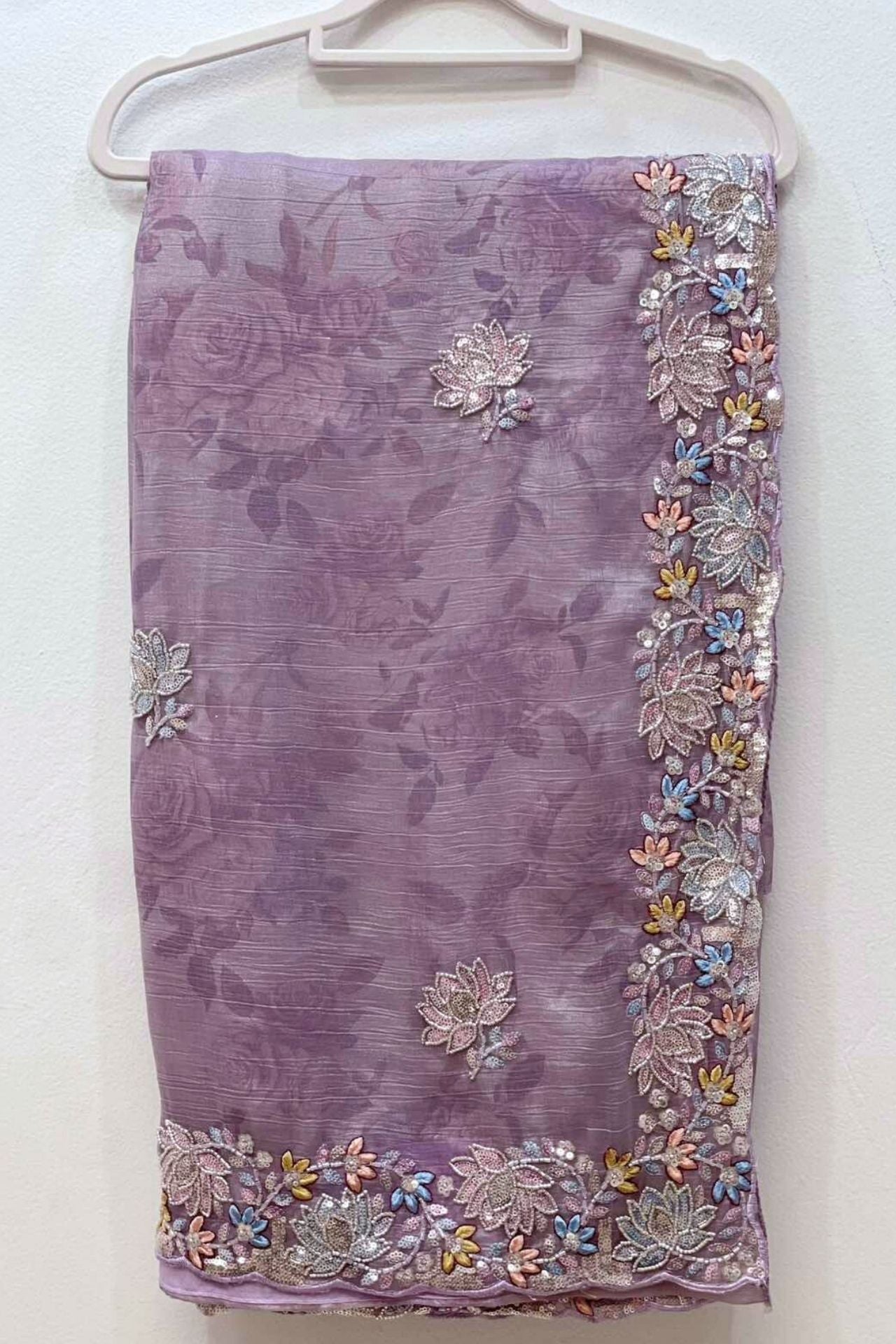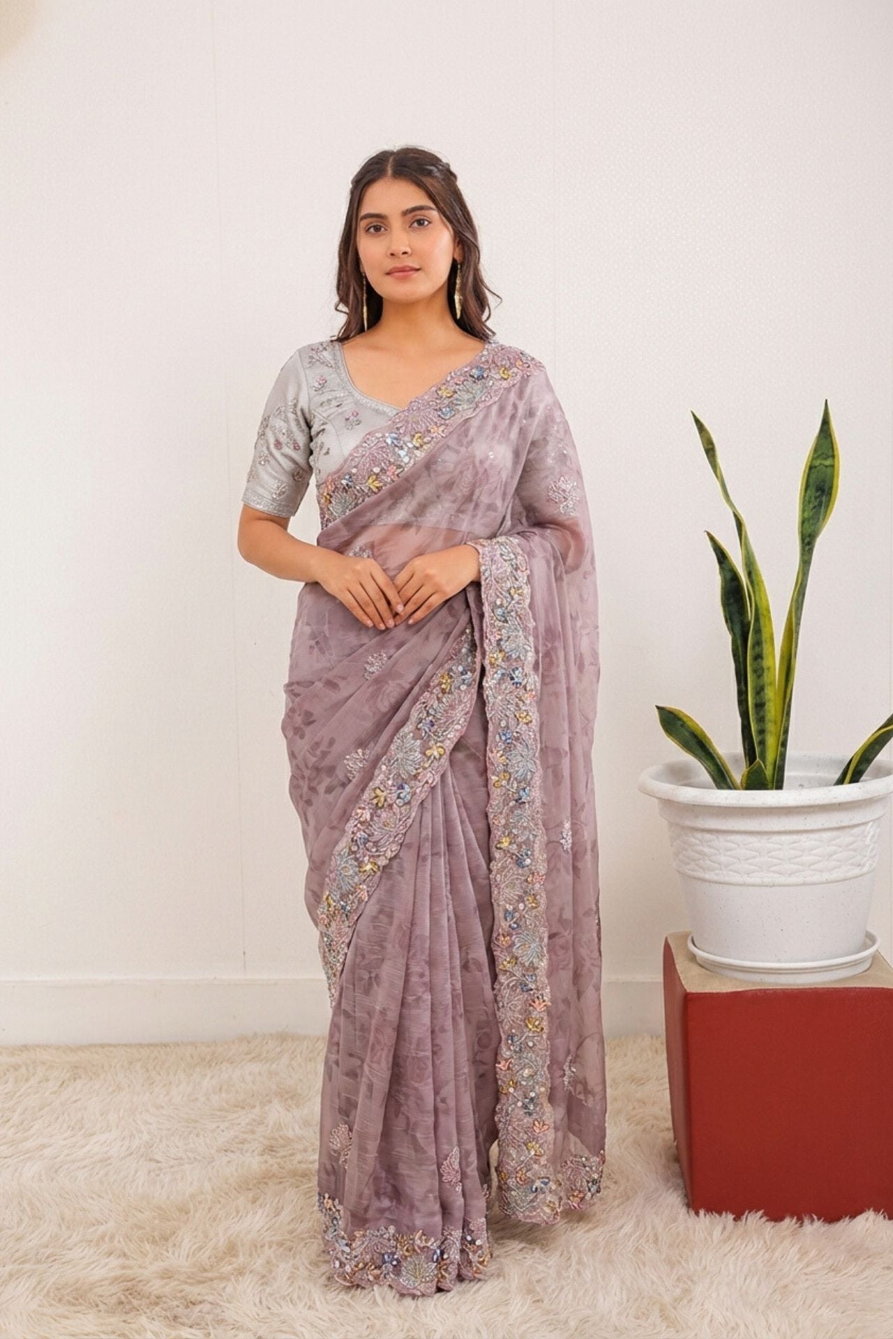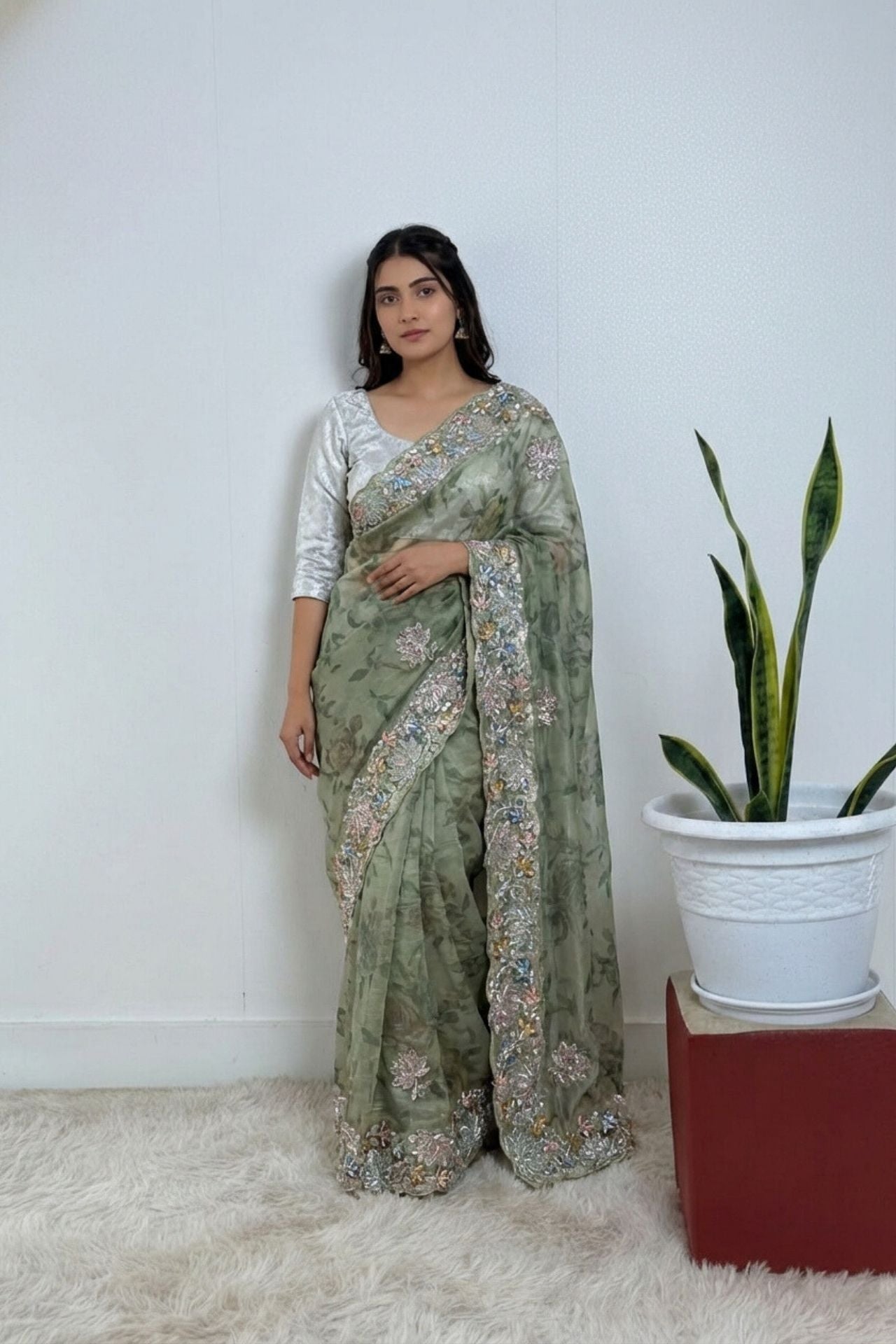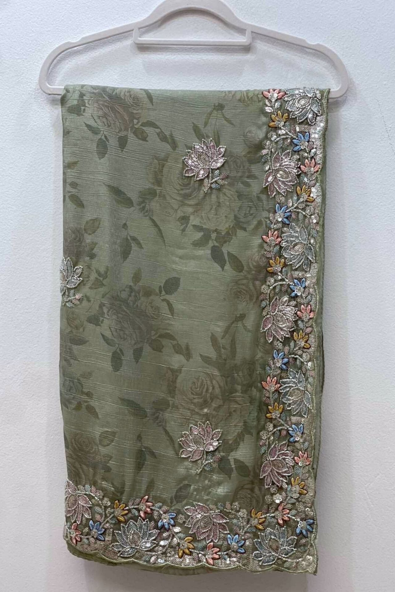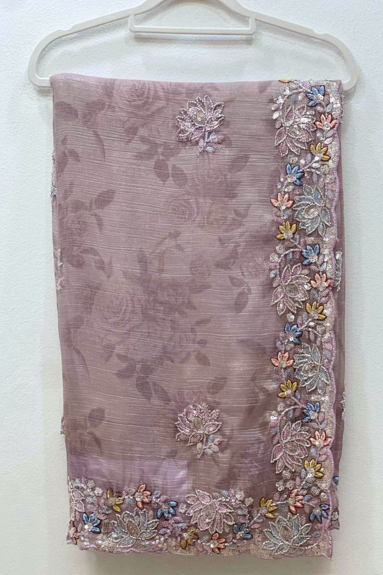 • Design: Features a faint tonal floral print on textured organza, beautifully complemented by an intricate, scalloped border with pastel floral embroidery and shimmering sequin work.