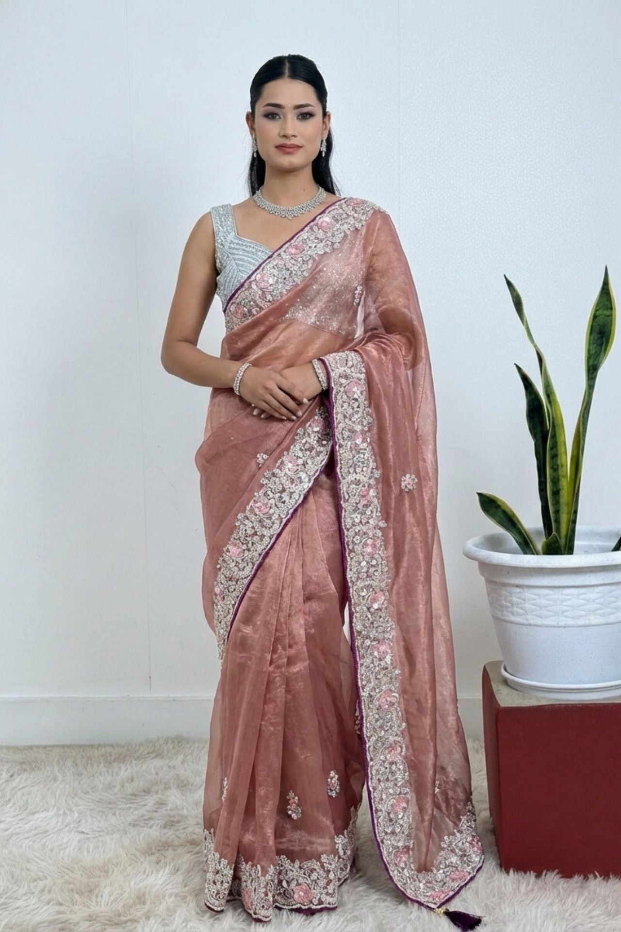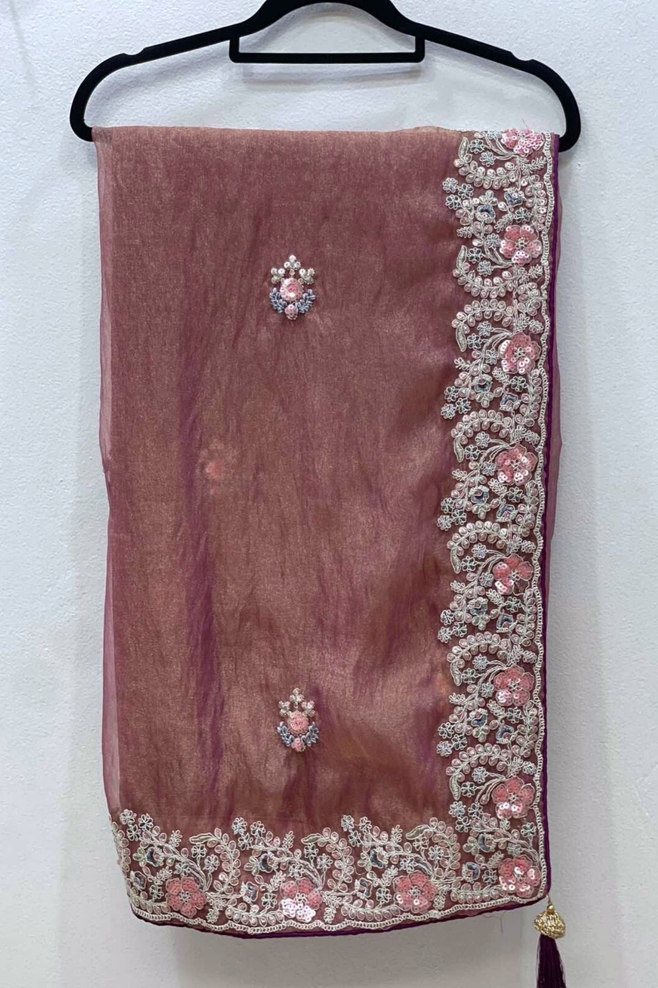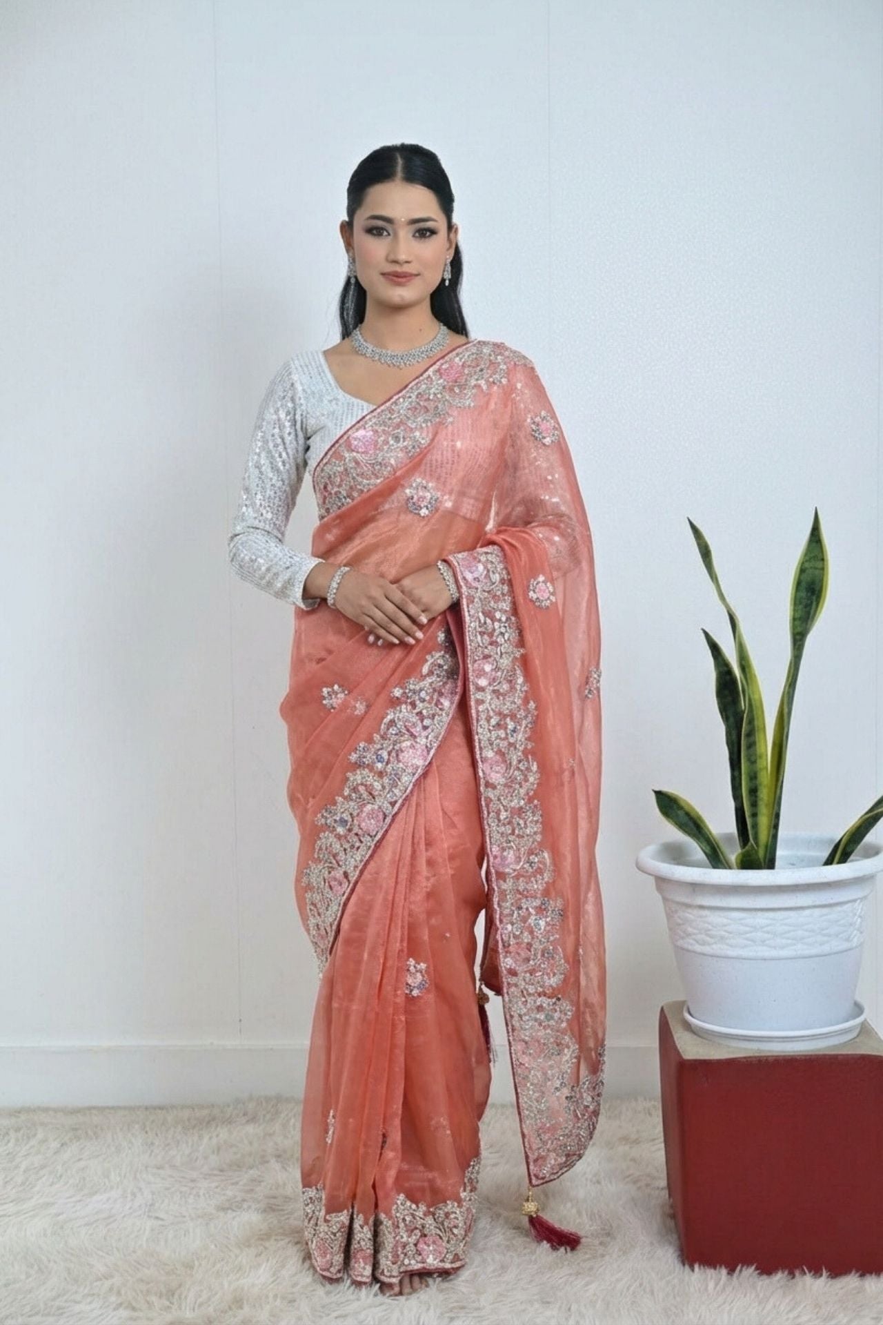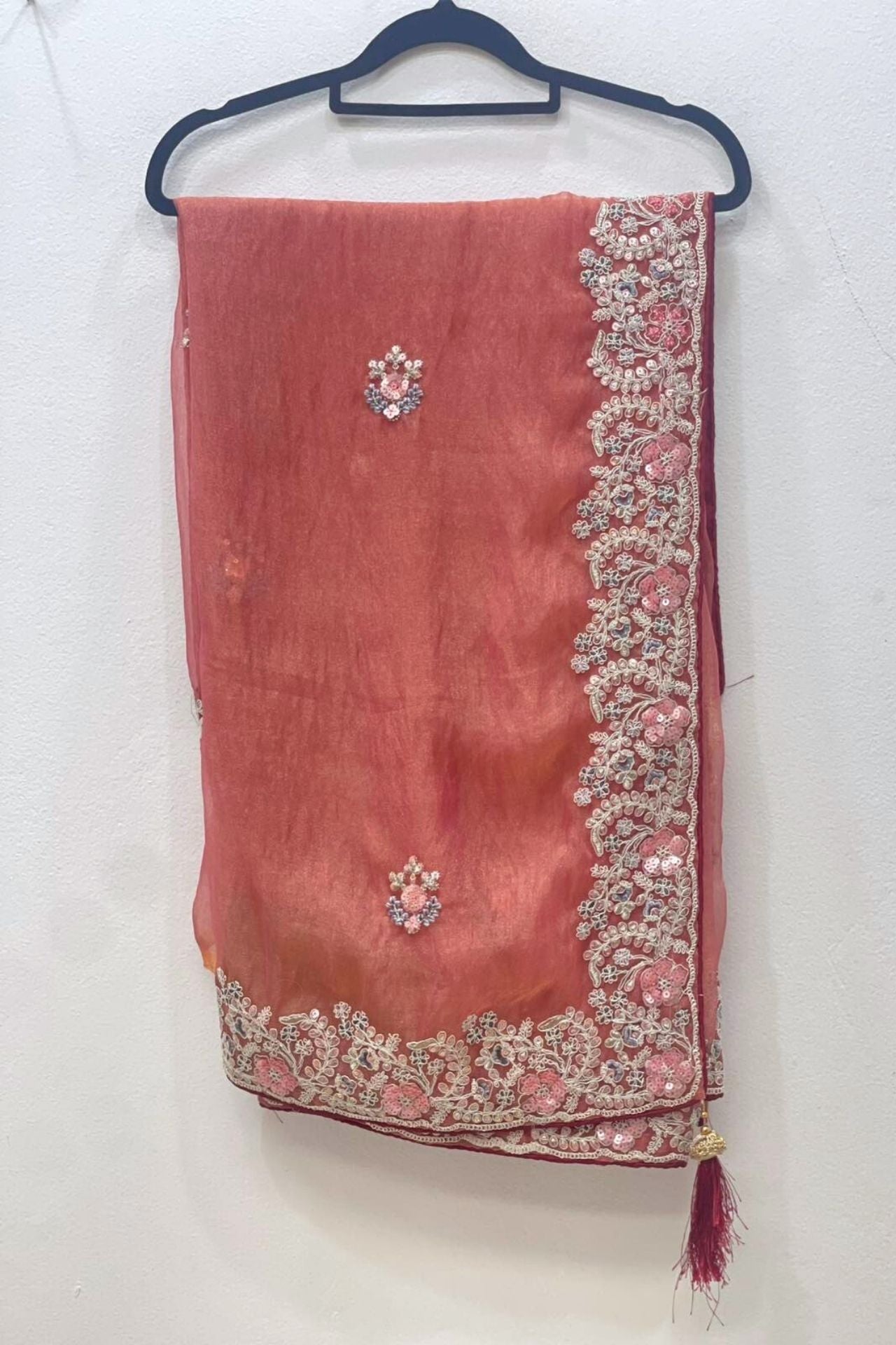 Design: Intricate floral borders featuring pink sequins, silver threadwork, and delicate bead clusters, complemented by scattered floral design.