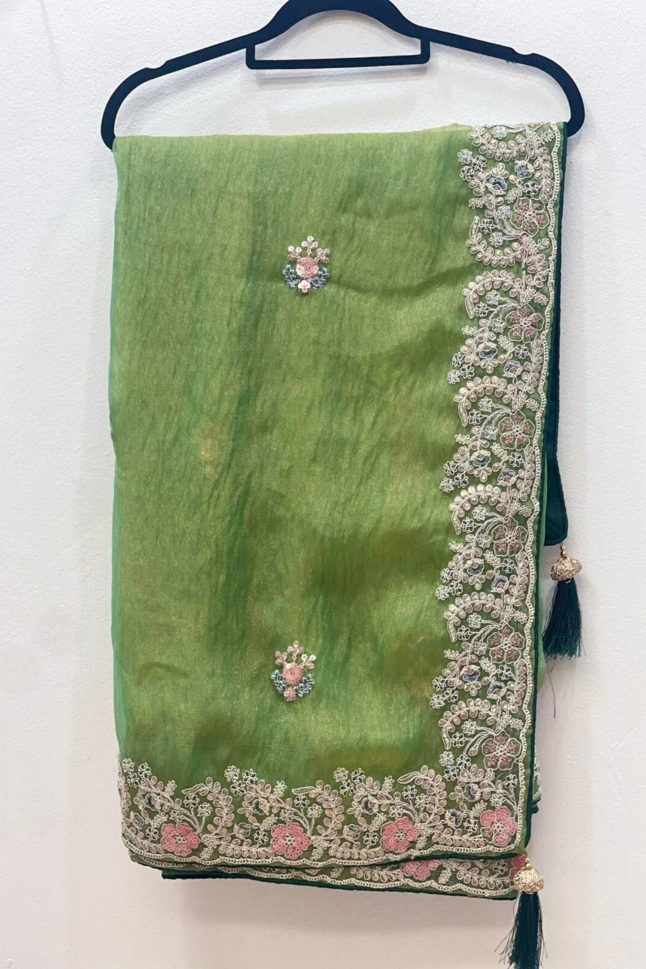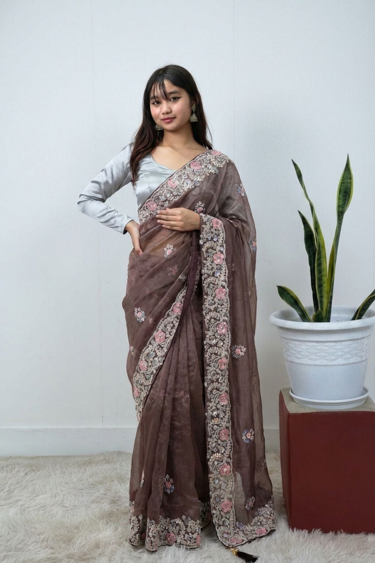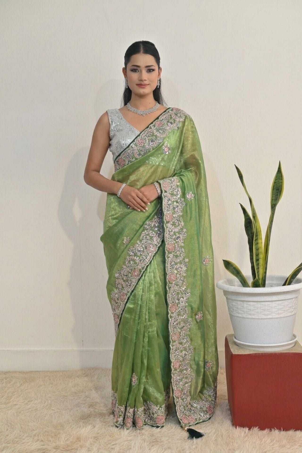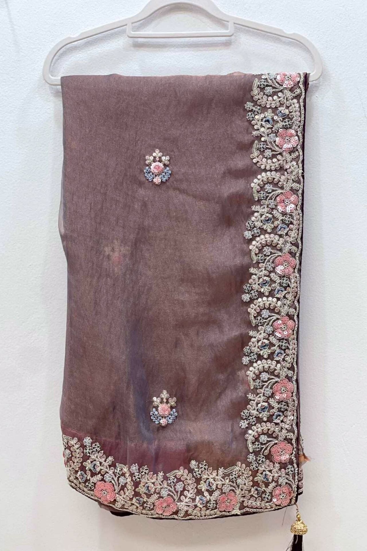 Design: Intricate floral borders featuring pink sequins, silver threadwork, and delicate bead clusters, complemented by scattered floral design.