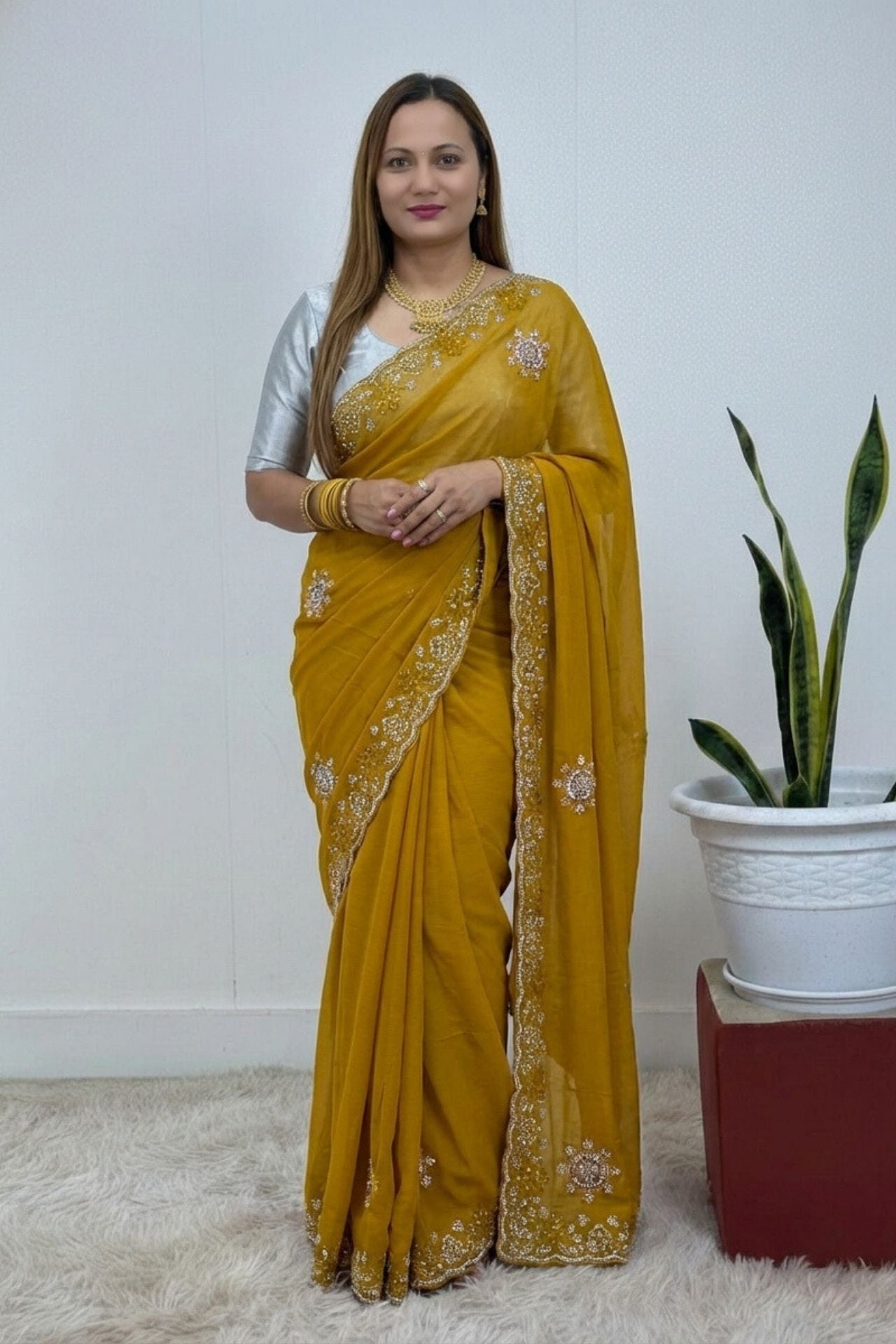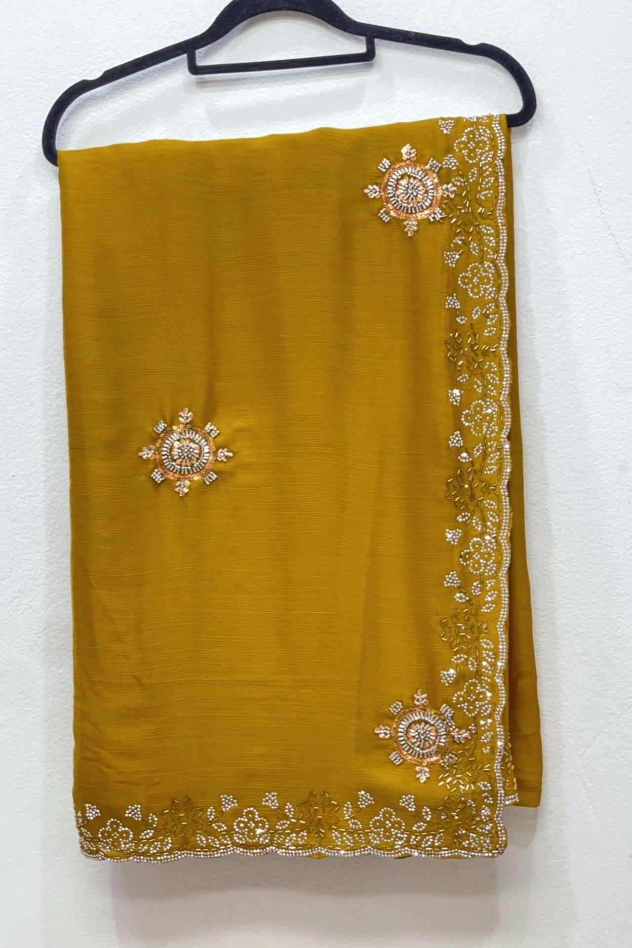 Design: Features a lightweight fabric with intricate silver and gold floral embroidery, circular sunburst motifs, and a heavy scalloped beadwork border.