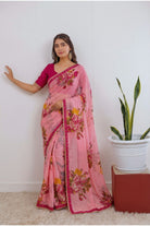 Features large, artistic floral motifs in shades of rose, yellow, and green, finished with a thin gold-toned embellished border.