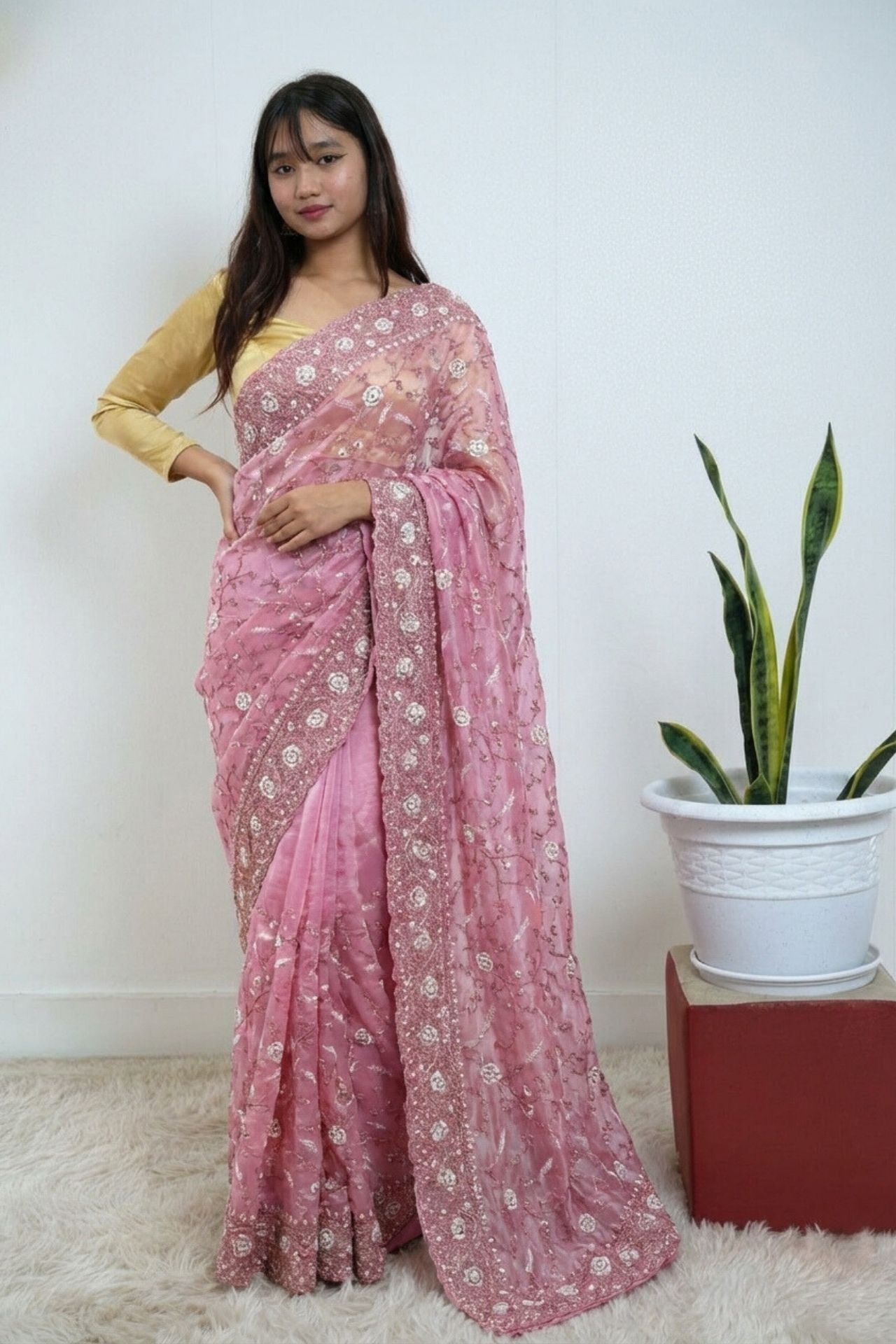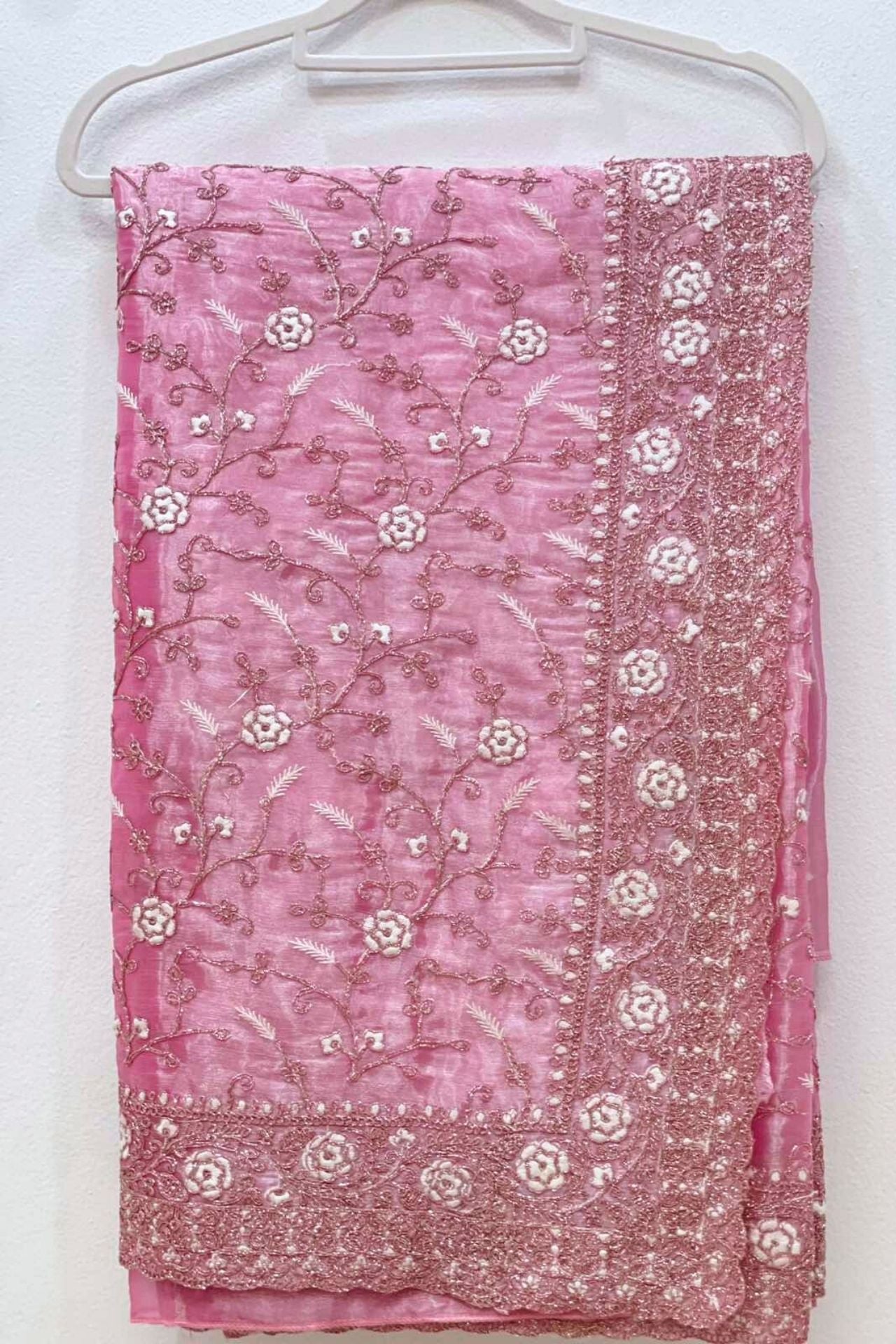 Pink Saree Floral Embroidery Work
