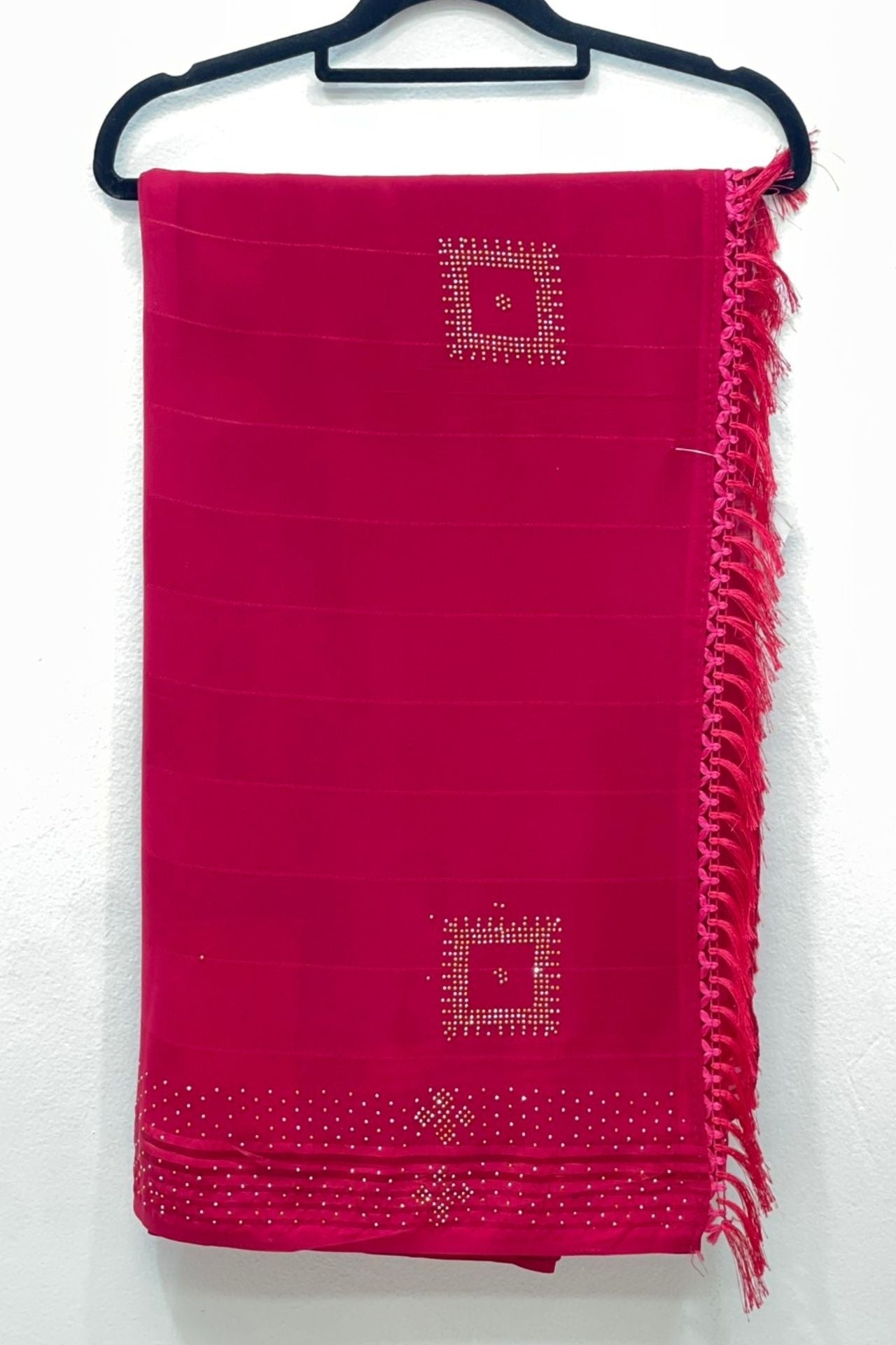 Design: Features a minimalist aesthetic with geometric stone-work motifs, a delicate sparkling border, and playful fringe tassels along the pallu.
