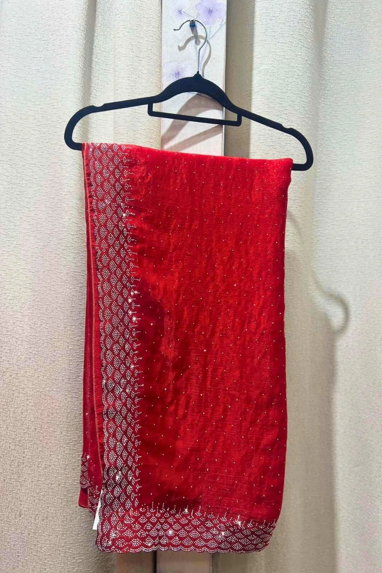 Design: A stunning garnet-red saree with a velvety sheen. Its design is both classic and grand, featuring an all-over sprinkle of sparkling stones that create a celestial effect, with a dramatic, heavily embellished scalloped border.