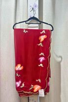 Design: A lightweight saree featuring a bold, hand-painted floral design that cascades down one side. The vibrant orange and pink flowers with green stems stand out against the rich red base, giving it a unique, artistic touch.