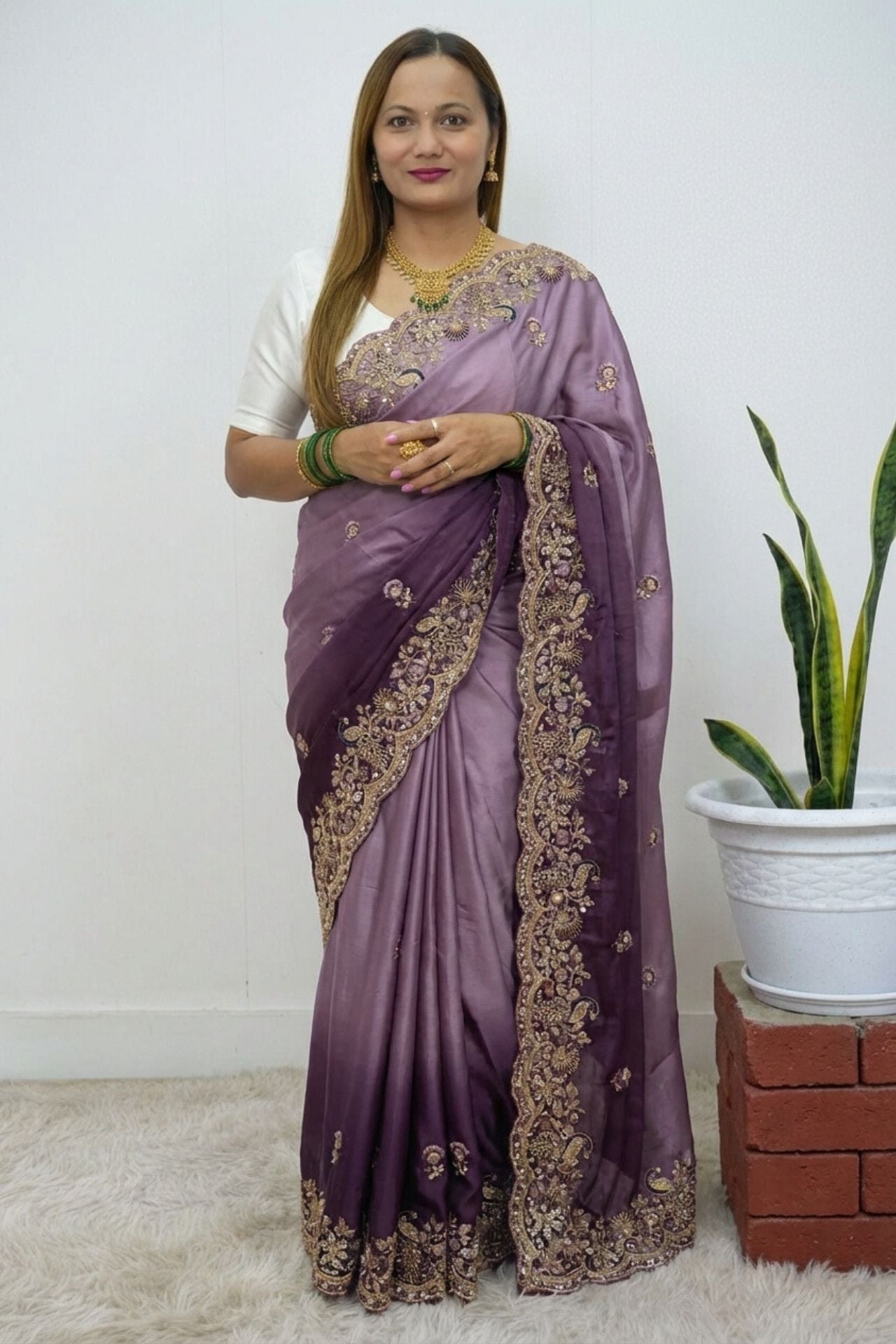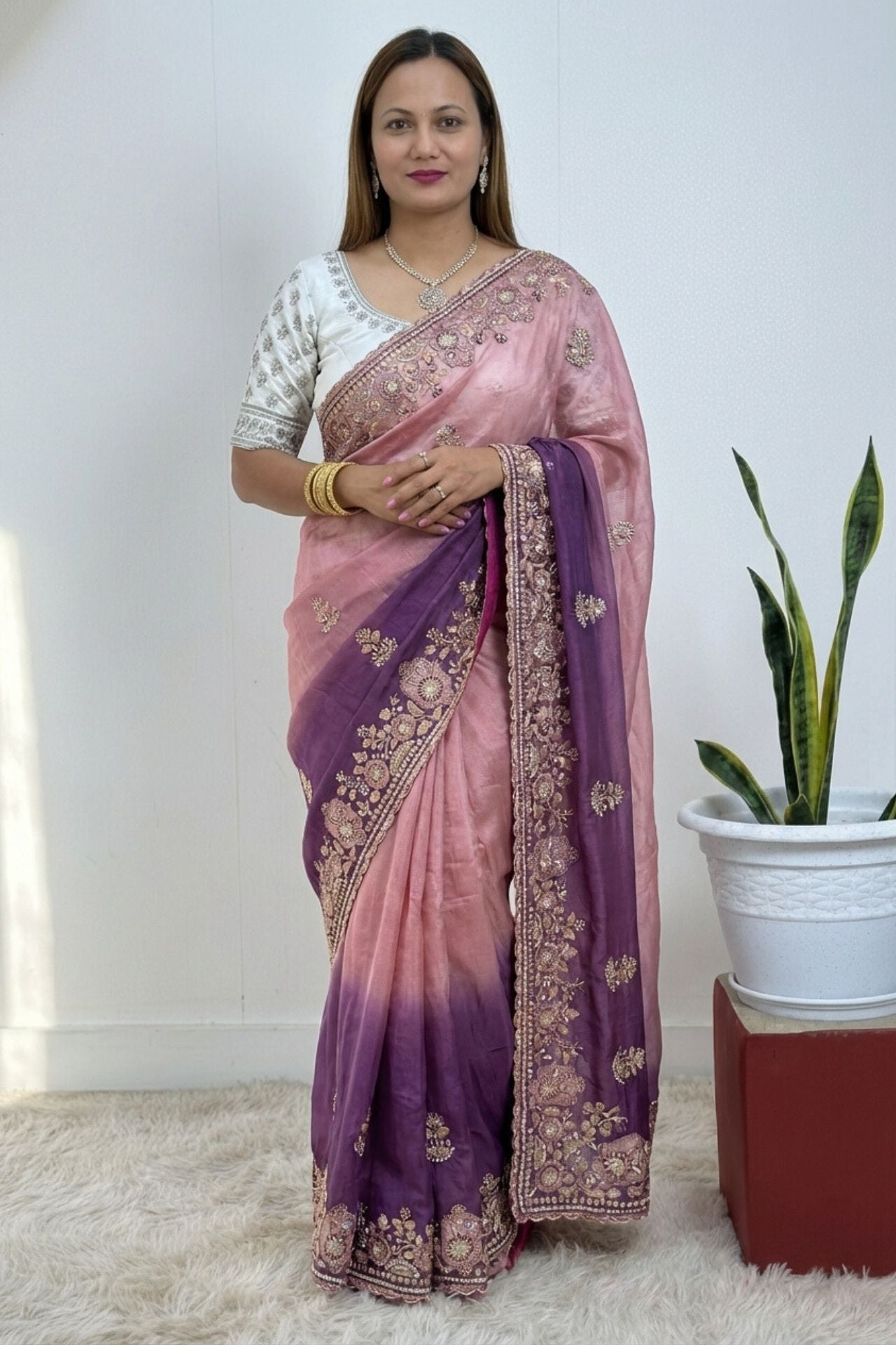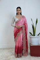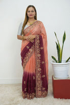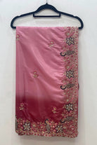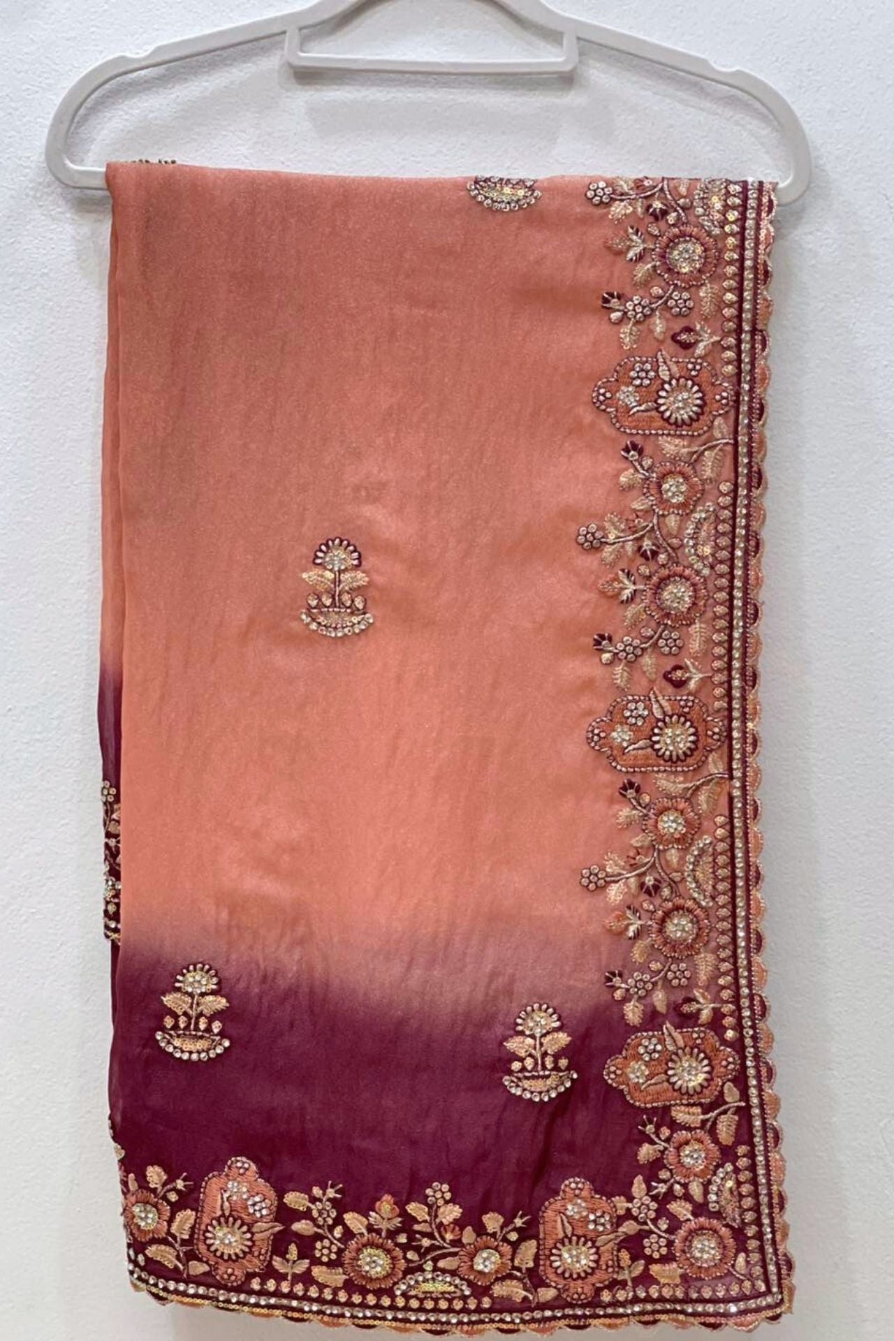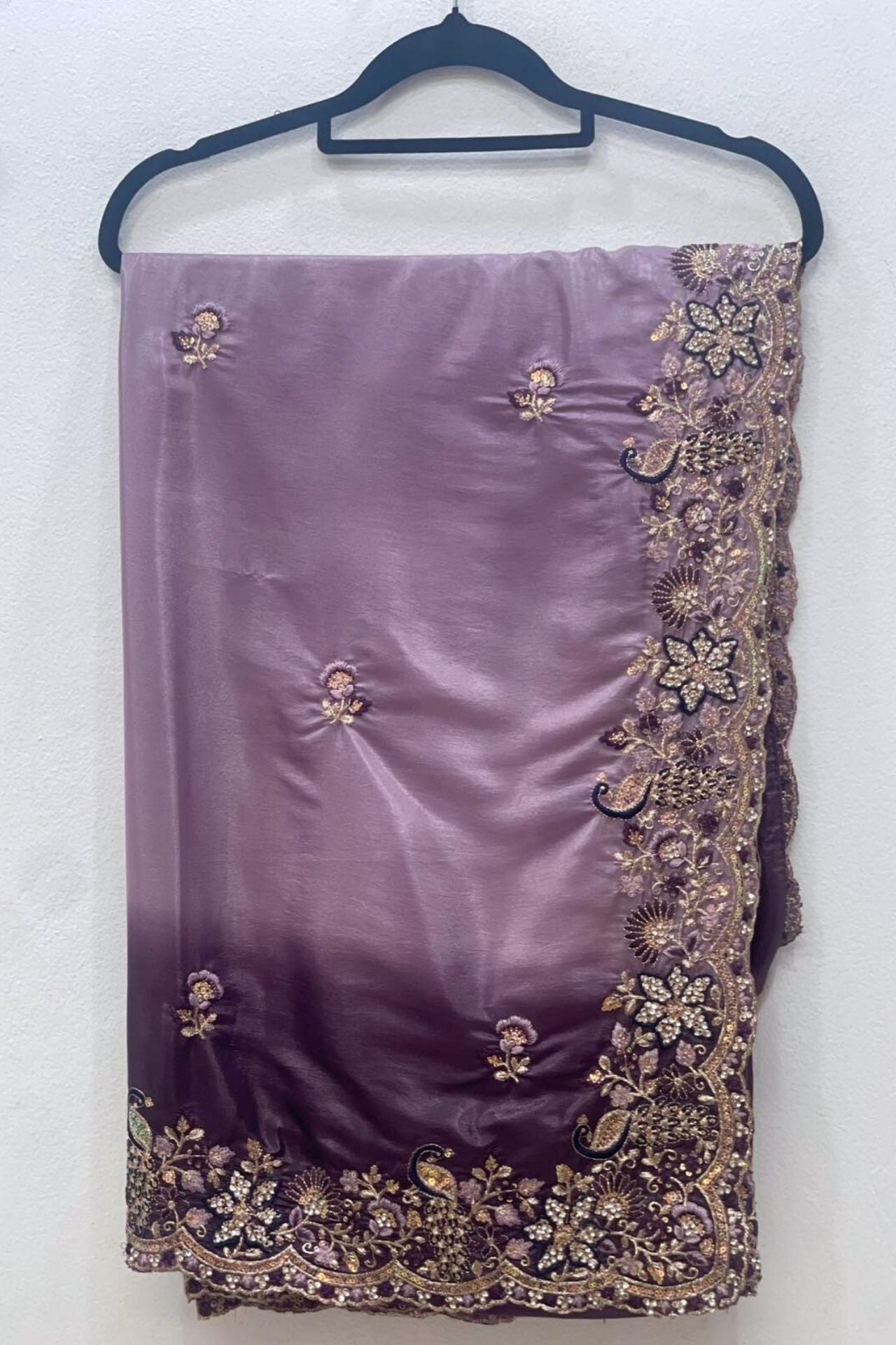 Design: The saree is adorned with intricate floral and vine embroidery along the border, highlighted by gold-toned threadwork and shimmering stone embellishments.
