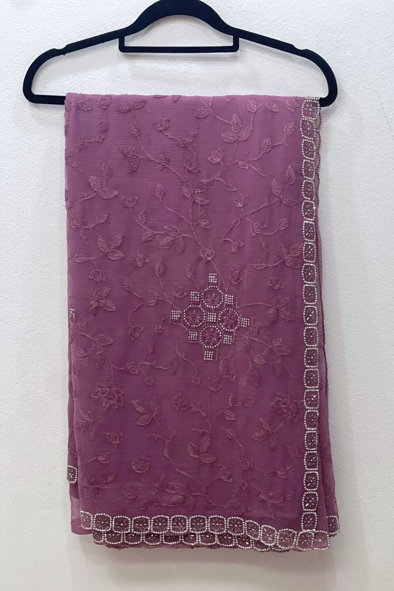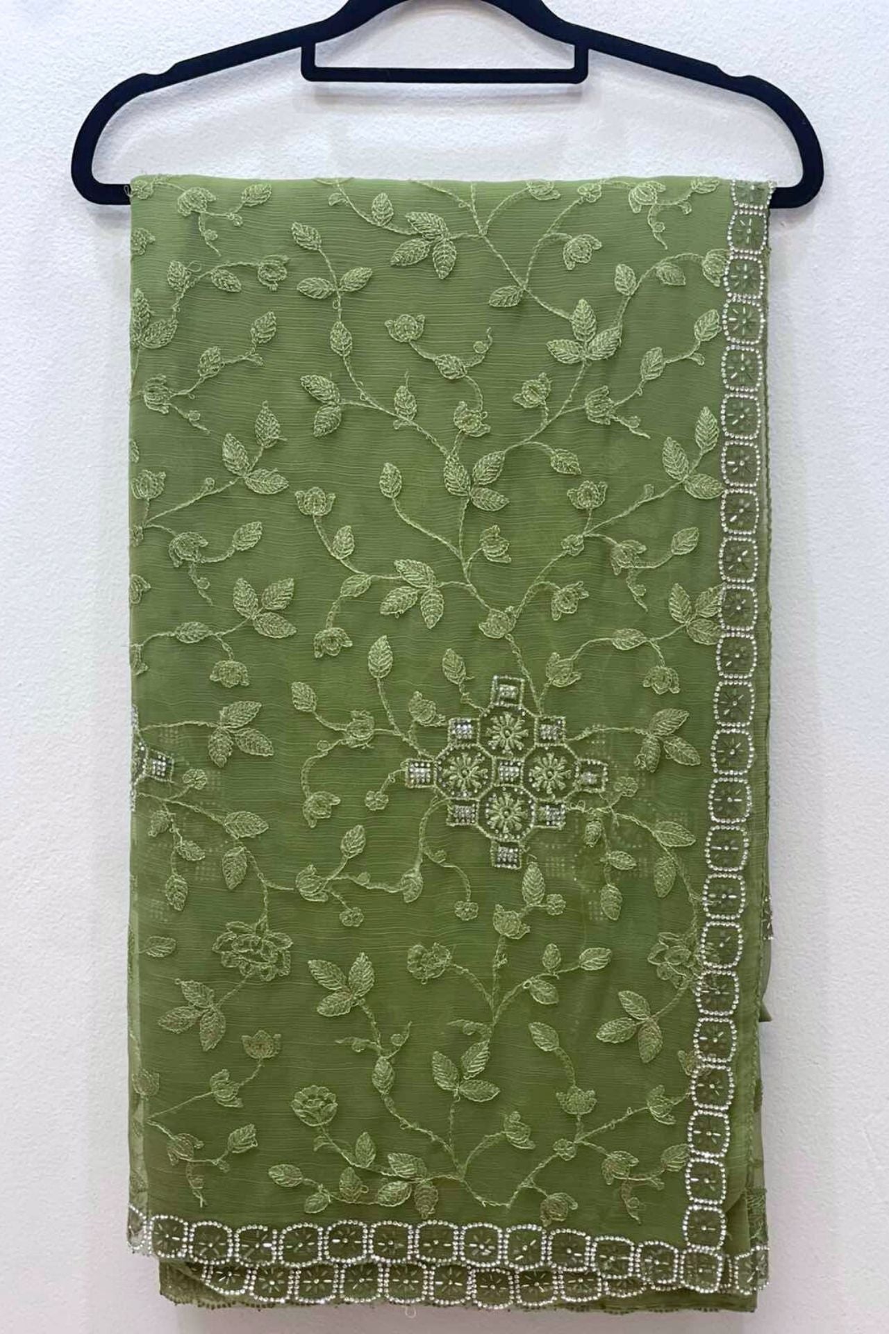 Design: Features an all-over intricate vine and leaf thread embroidery with geometric floral motifs and a dainty mirror-work border.