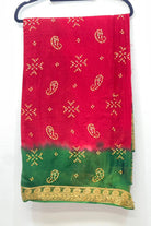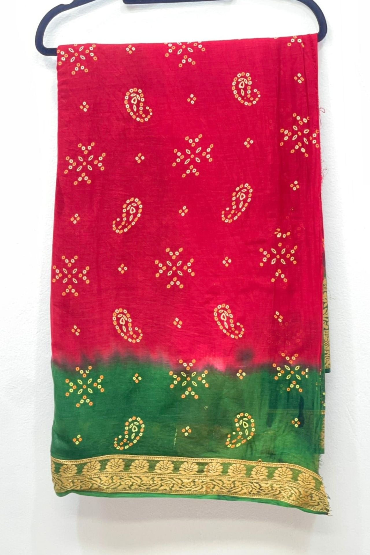 Design: Adorned with classic Bandhani tie-dye patterns and elegant paisley motifs, finished with a rich gold-toned floral Zari border.