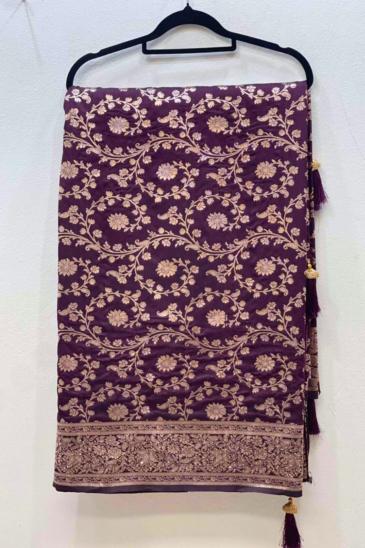Design: Intricate floral vine patterns woven throughout the body with a heavily detailed Zari border and decorative tassels.